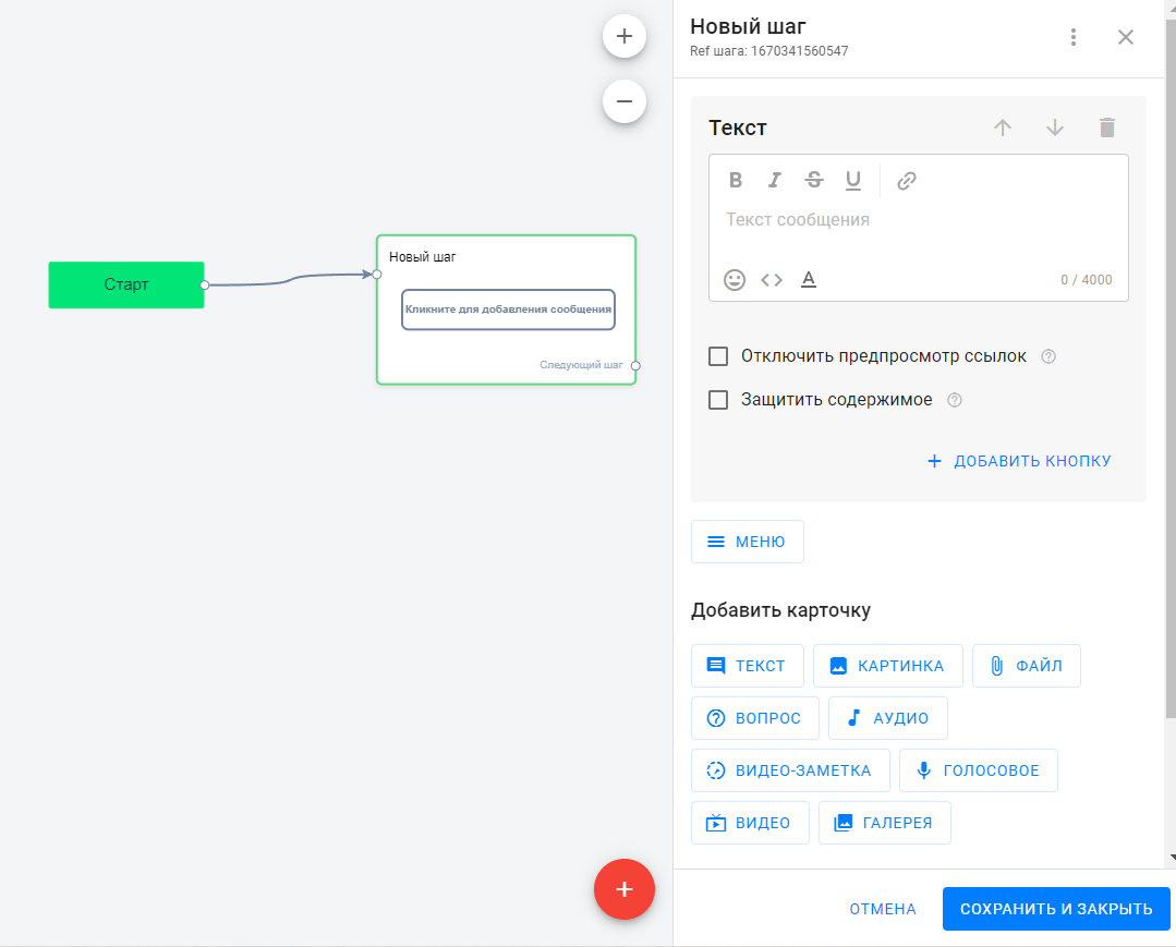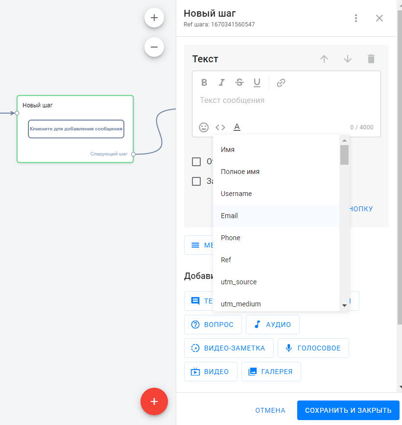 Добавить к тексту можно изображения, файлы в виде документов, аудиофайлы, видеозаметки, голосовые сообщения, видео, кнопки с url или переходом на другой шаг.