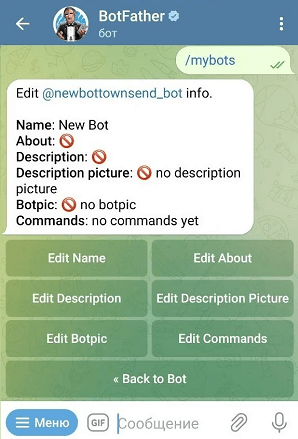 Нажав на кнопку «Edit Bot», вы увидите список команд для редактирования: