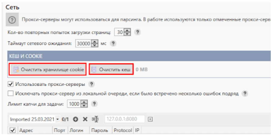 3.Перед тем как удалить или добавить новый прокси необходимо сбросить старые данные в разделе “Кеш и cookie”.Для этого нажмите на “Очистить хранилище cookie” и “Очистить кеш”, чтобы сбросить старые данные прокси, которые у вас были до этого и добавить новые.