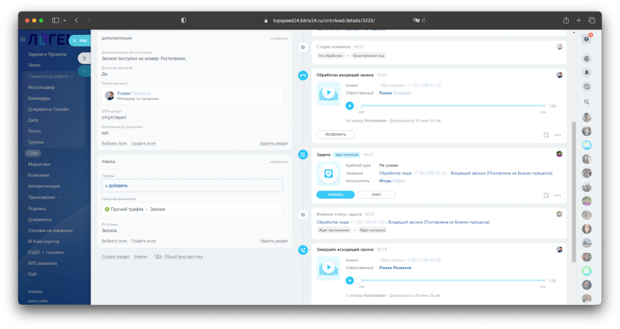 Записи всех телефонных разговоров автоматически прикрепляются к карточке клиента в системе. Менеджерам это помогает освежить в памяти детали разговоров, а руководству — контролировать качество работы сотрудников. Руководители могут прослушивать записи, выявлять ошибки, анализировать эффективность взаимодействия и при необходимости корректировать процесс обслуживания клиентов. В случае отсутствия ответственного менеджера другой сотрудник может быстро ознакомиться с историей звонков и продолжить работу с текущим клиентом.