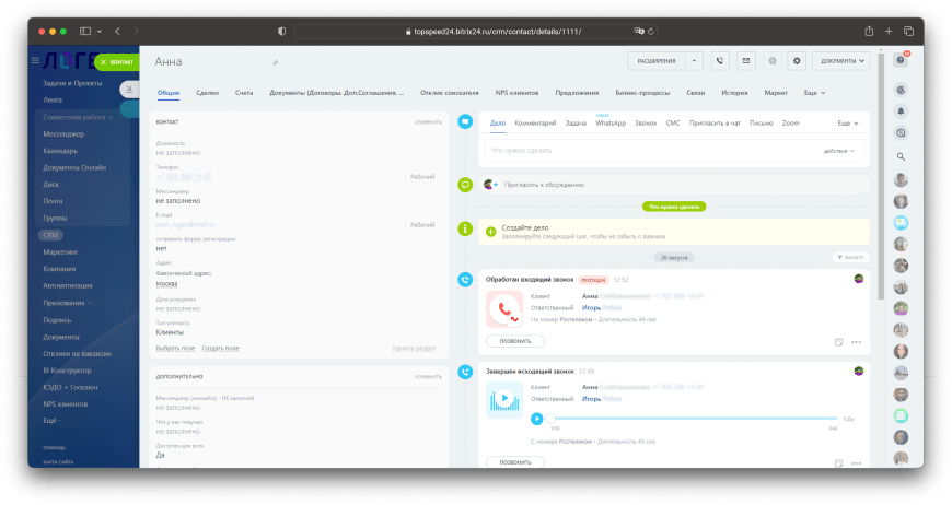 Если клиент, уже зарегистрированный в системе, звонит повторно, система немедленно распознает его и отображает полную историю взаимодействия. Эта опция позволяет менеджерам сразу просматривать всю необходимую информацию о клиенте, включая его активные сделки и предыдущие обращения. Такой подход ускоряет работу и улучшает качество обслуживания.