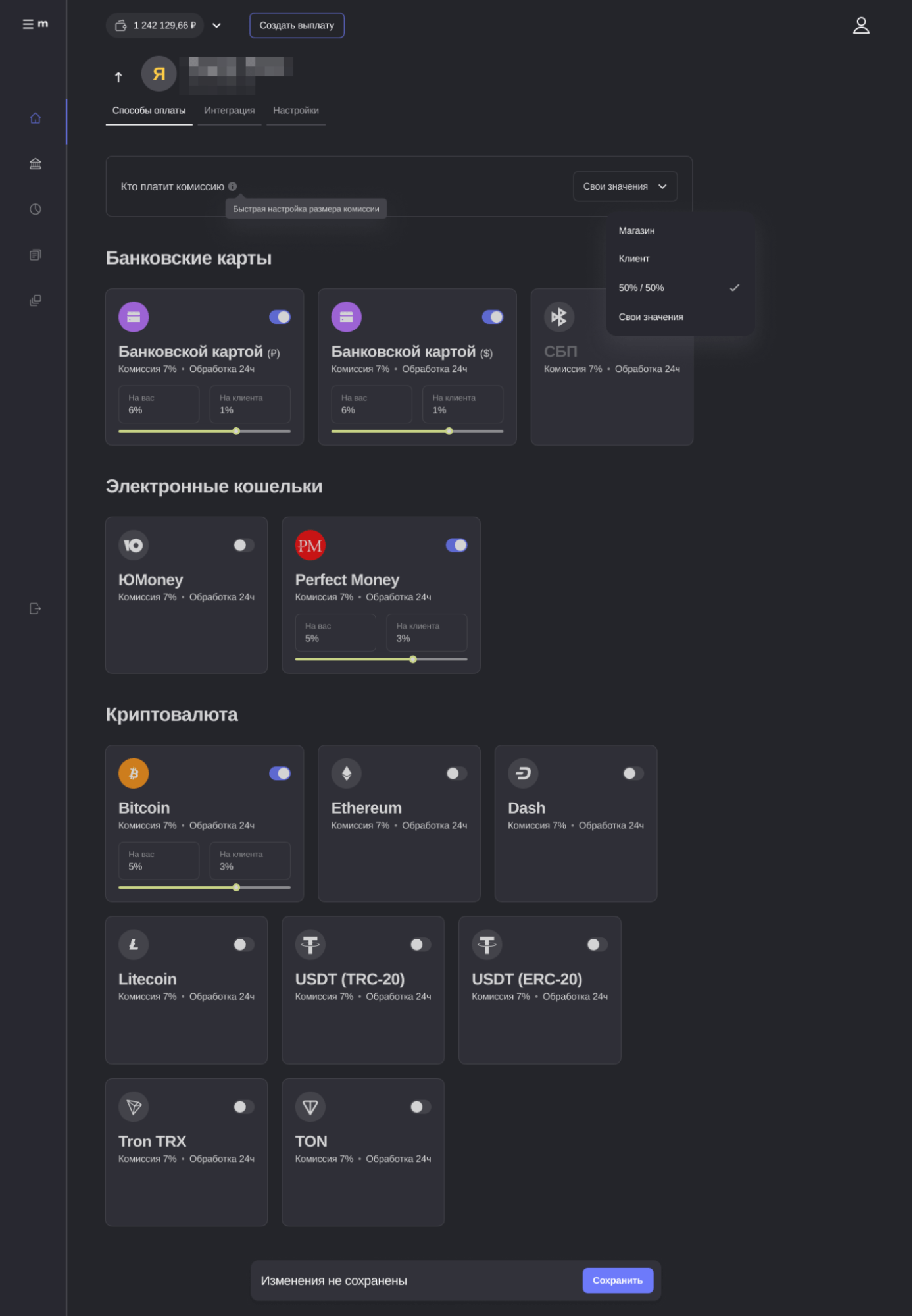 В личном кабинете Morune вы можете вручную настраивать размер комиссий для каждого способа оплаты. Это дает вам полное право контроля и возможность оптимизировать свои затраты в зависимости от выбора клиента.