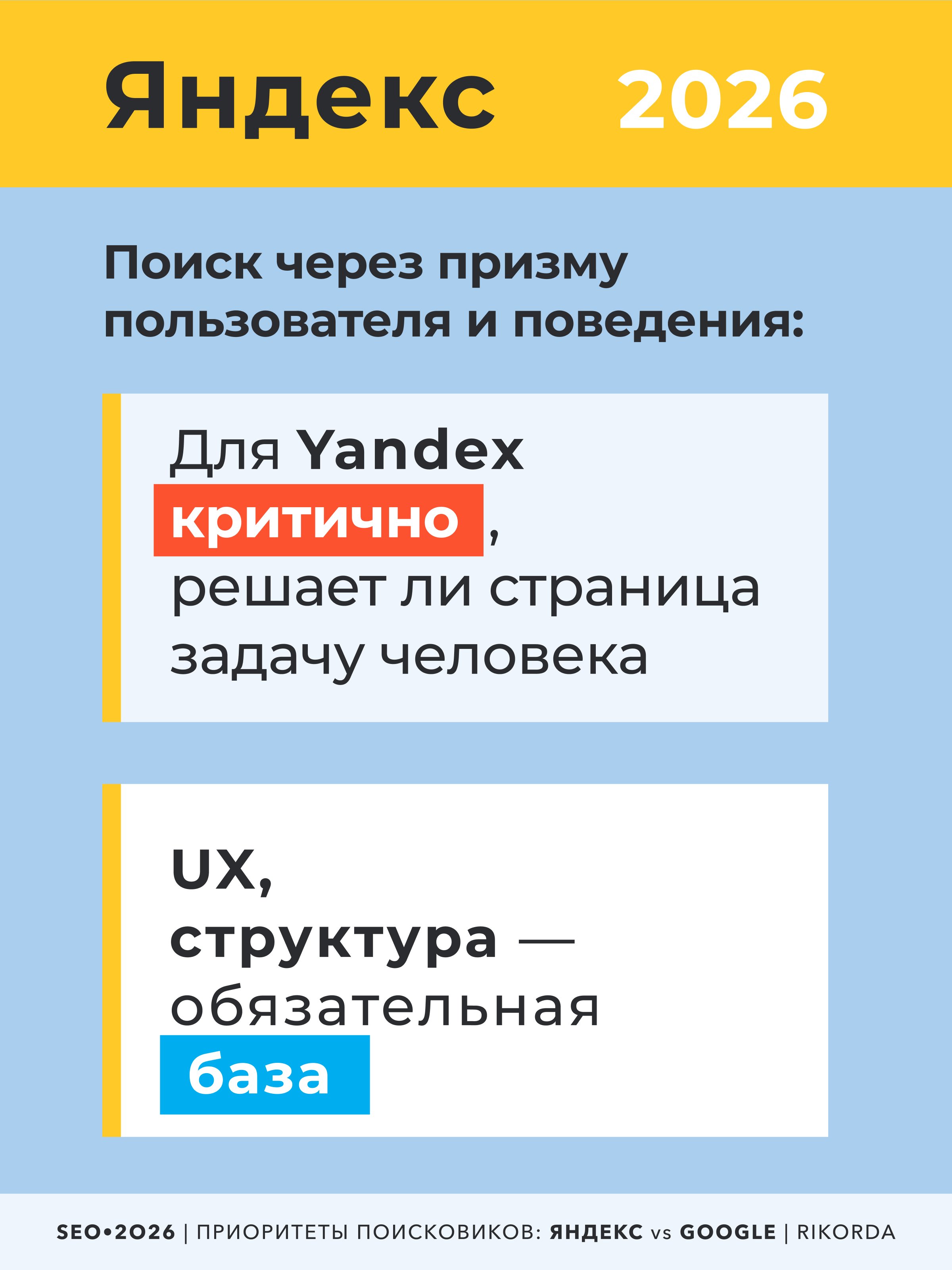 Несмотря на схожие технологические тренды, Яндекс и Google по-разному оценивают качество сайтов и расставляют акценты в ранжировании. Попытка оптимизироваться «одинаково под всё» всё чаще приводит к нестабильным результатам.