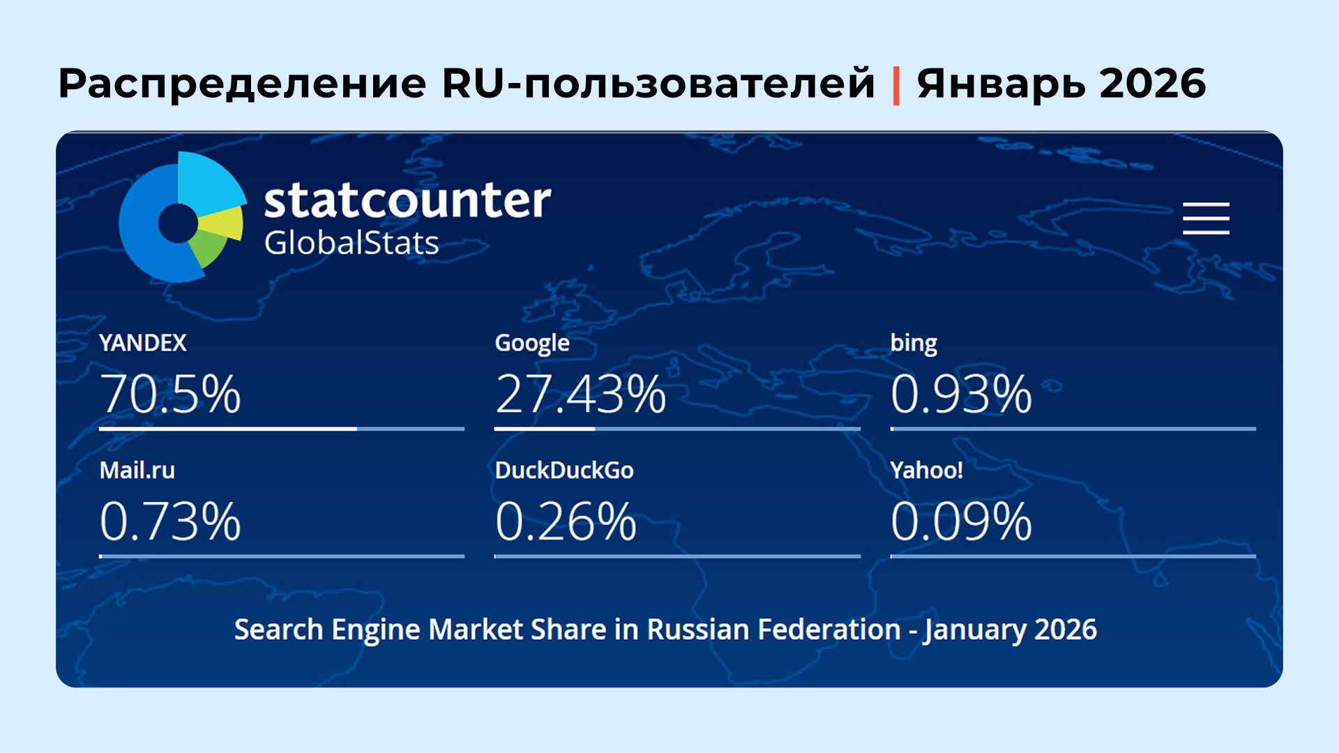 По данным Statcounter Global Stats на январь 2026 года доля google.ru среди российских пользователей составила 28%.