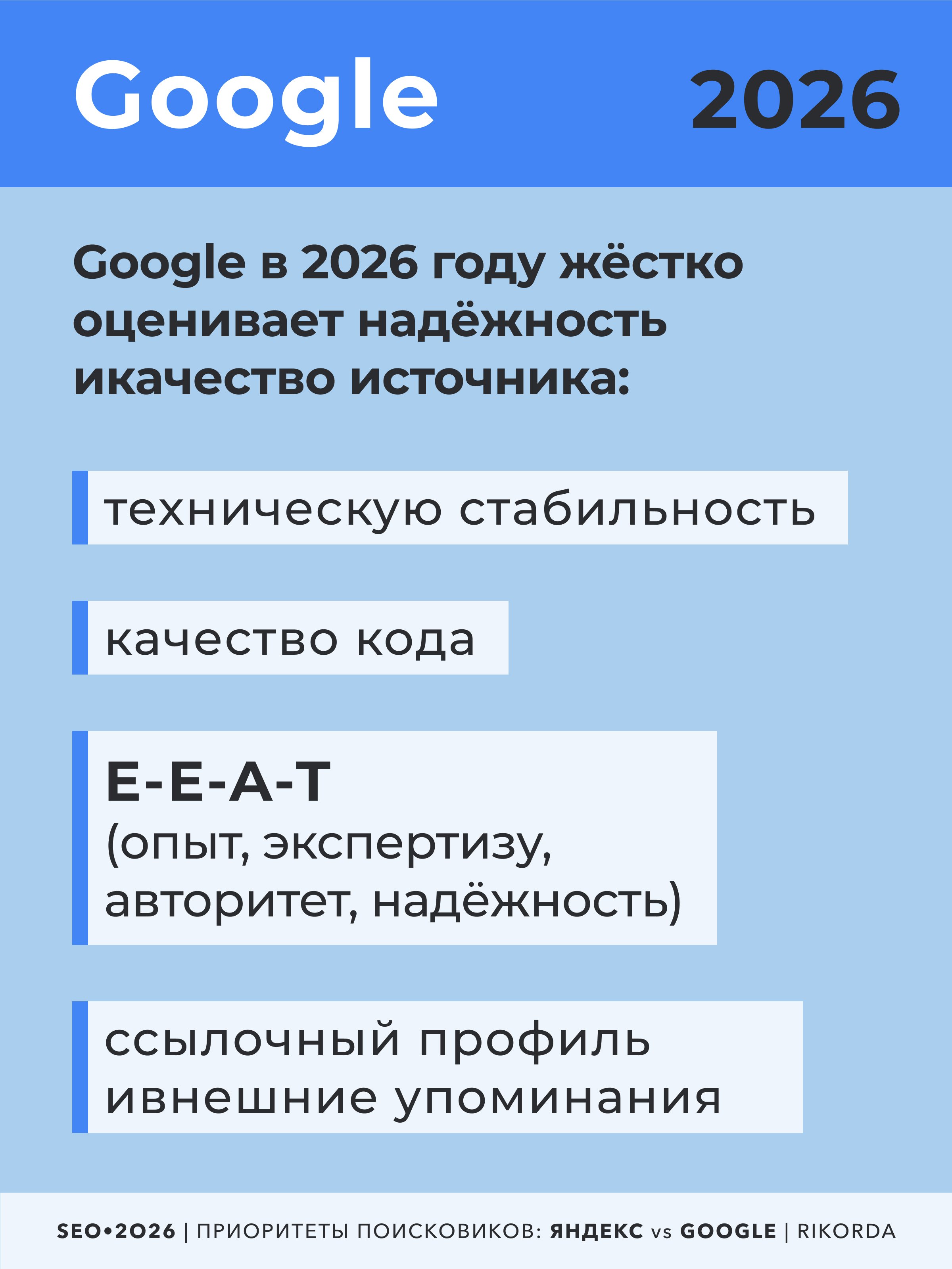 Google жёстче подходит к оценке надежности и качества источника. В 2026 году он особенно внимательно анализирует: