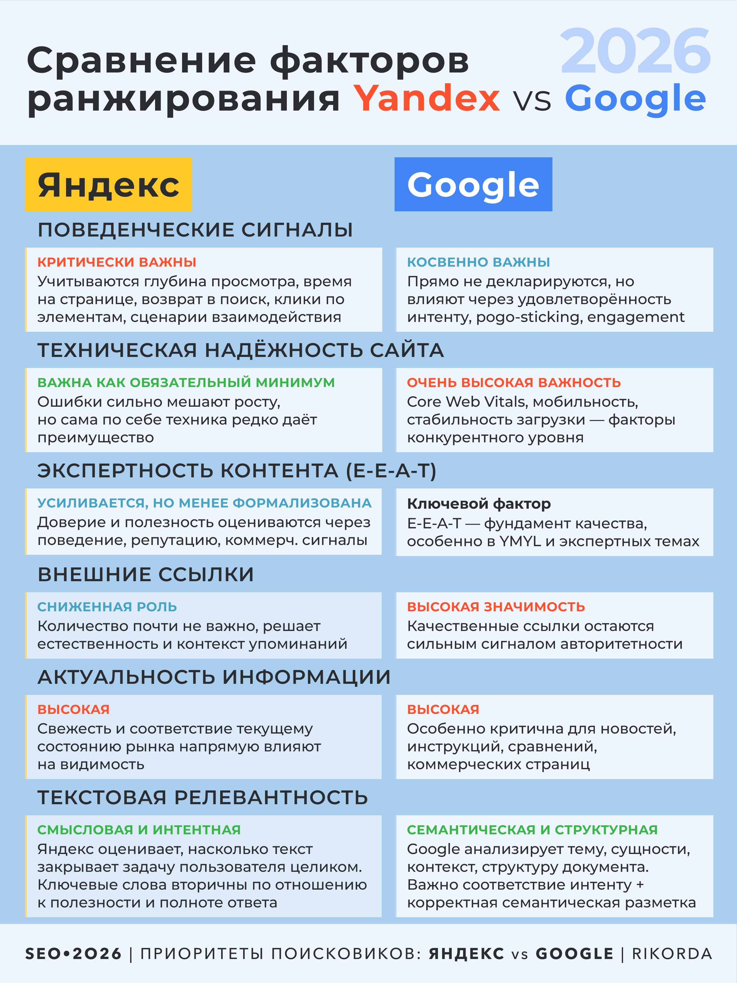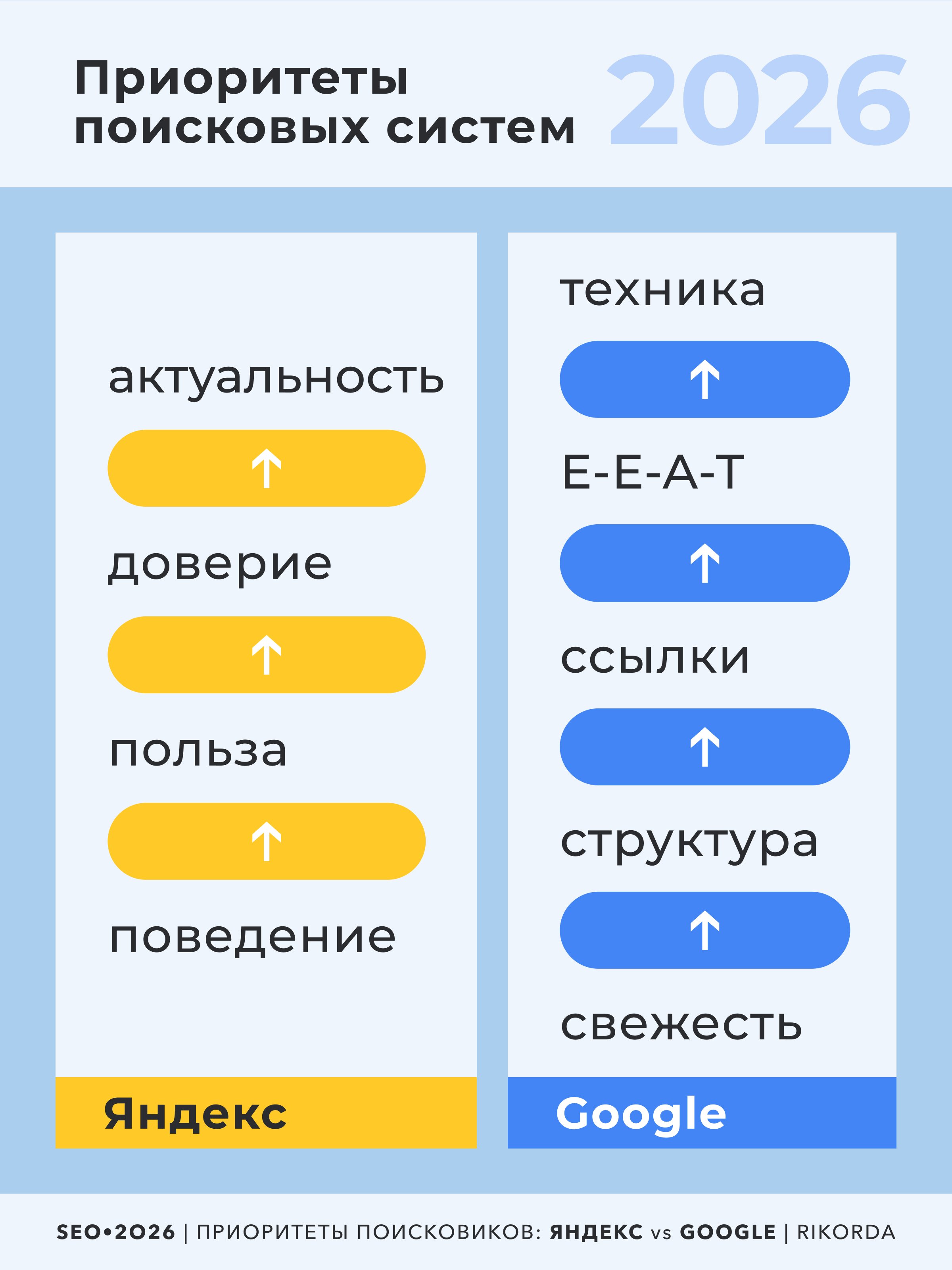 Для бизнеса универсальной SEO стратегии больше не существует, а есть необходимость осознанного выбора методов и приоритетов под конкретную поисковую систему. То, что усиливает позиции в Яндексе, не всегда даёт сопоставимый эффект в Google и наоборот. Поэтому следующий логичный шаг – разобрать, какие факторы ранжирования находятся в приоритете у каждой системы, и как это учитывать при выстраивании SEO стратегии в 2026 году.