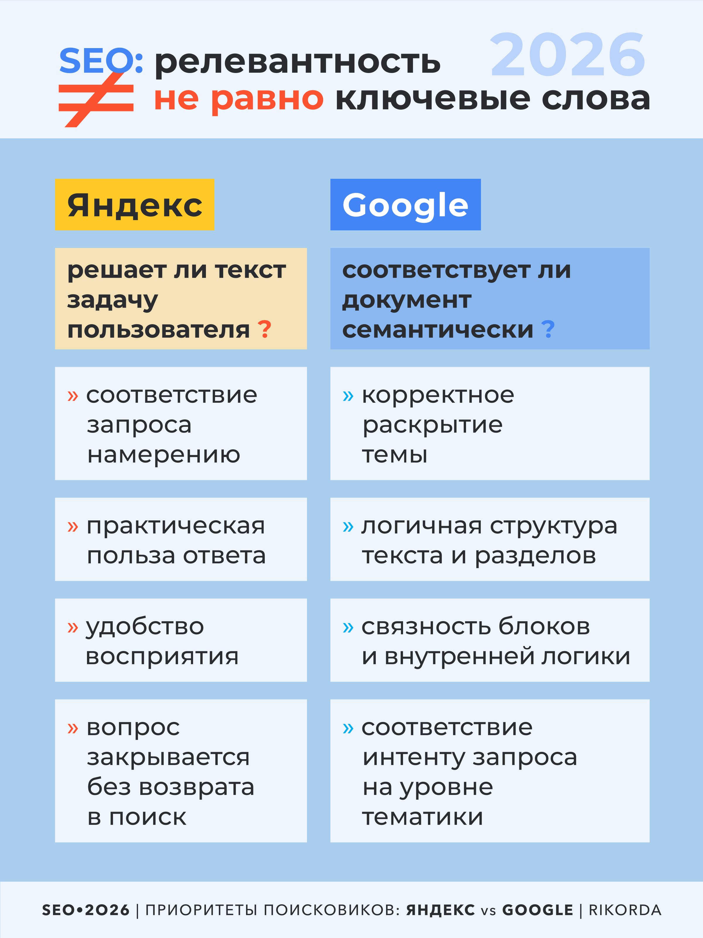 В 2026 году ни Яндекс, ни Google не воспринимают релевантность как набор совпадений по ключевым словам. Речь идёт о смысловой, интентной и контекстной релевантности, о том, насколько текст реально соответствует задаче пользователя и теме запроса.