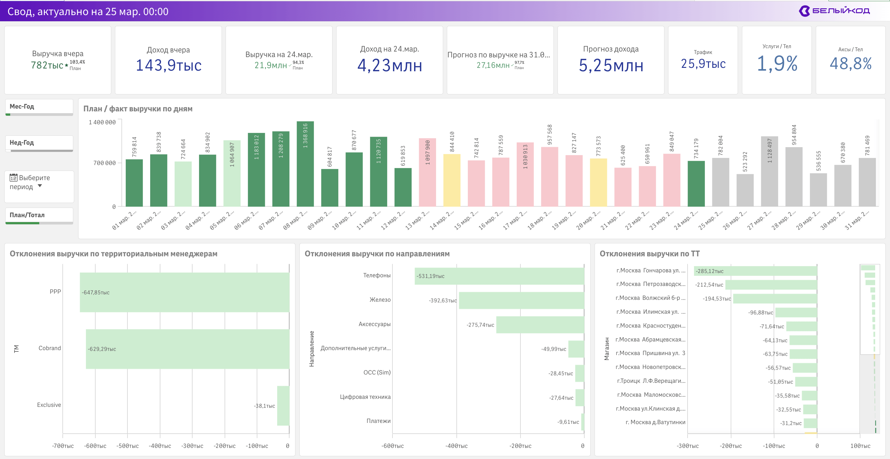 С помощью листа продаж по дням можно углубиться в цифры конкретного дня и также увидеть их в разрезе территориальных менеджеров, регионов, магазинов и категорий.