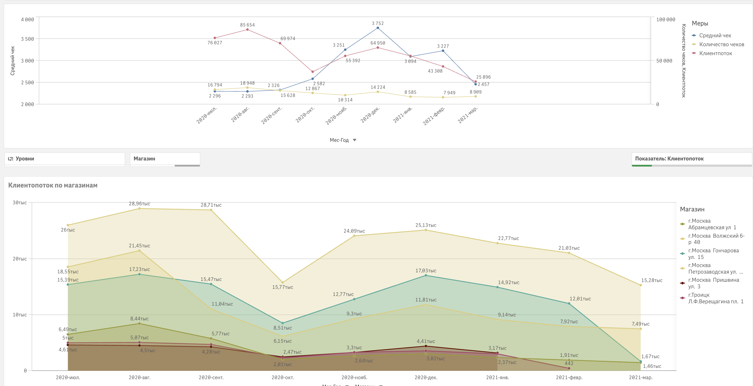 Важный элемент — анализ трендов и сезонность продаж в разрезе магазинов/категорий. Это помогает быстро увидеть рост и падение продаж и, не выходя из витрины, выявить причину. А с помощью дашборда «Сравнительный анализ» можно сопоставить периоды в разных торговых точках, а также проанализировать работу продавцов.