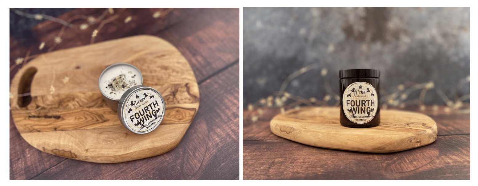 Успешный мерч обычно использует элементы книги. К примеру, мерчшопы книжных издательств выпускают одежду и аксессуары с культовыми цитатами, названиями или атрибутами из разных вселенных. Так, к роману Fourth Wing издательство Red Tower Books выпустило брендированные ароматические свечи с именами героев.