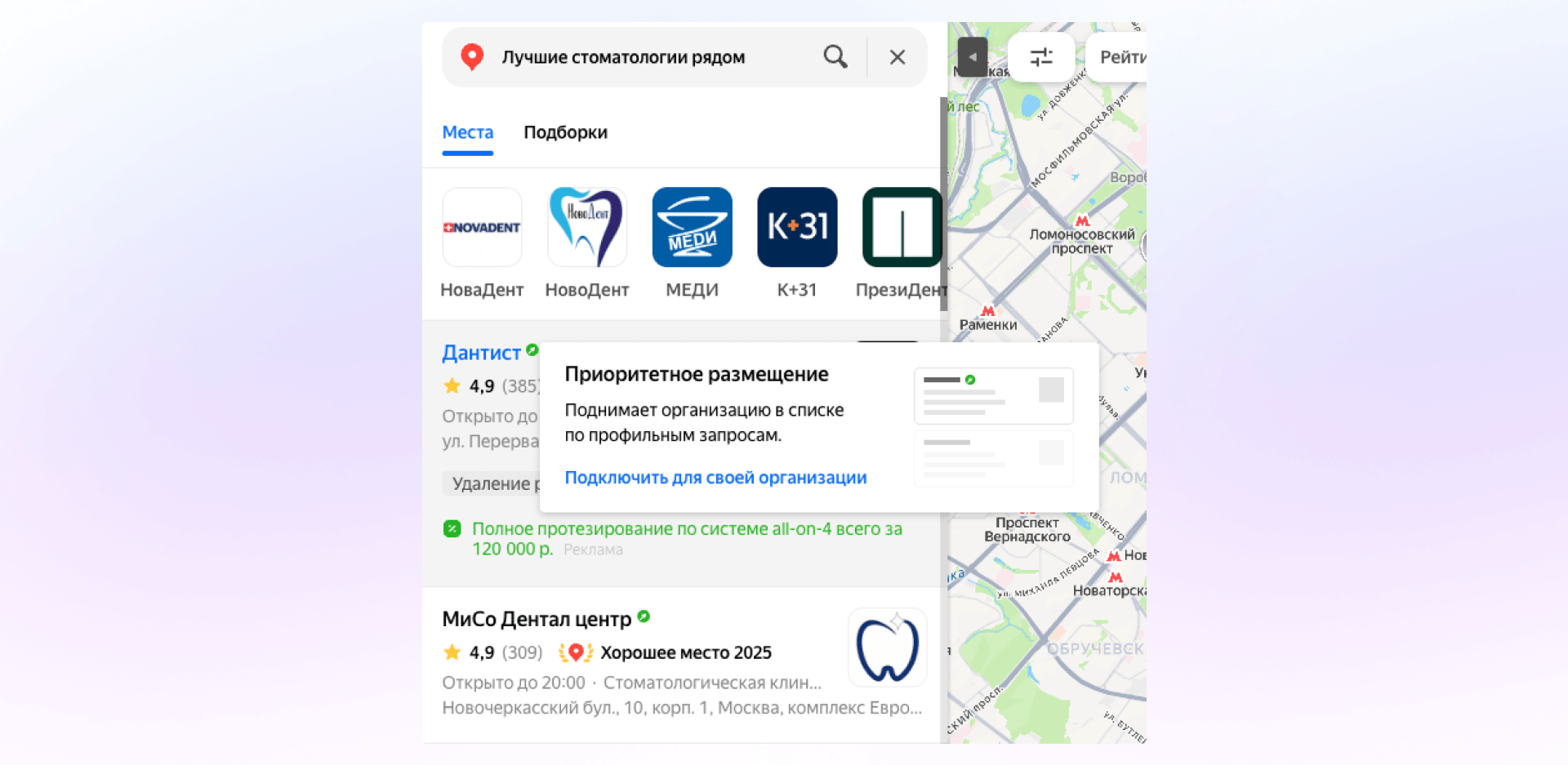 Один из наиболее эффективных инструментов это приоритетное размещение. Если у вас уже есть карточка компании и вы более-менее за ней следите, представители Яндекса, скорее всего, свяжутся с вами и предложат запустить рекламные активности. Среди них будут подписка, брендированное размещение и реклама в навигаторе.