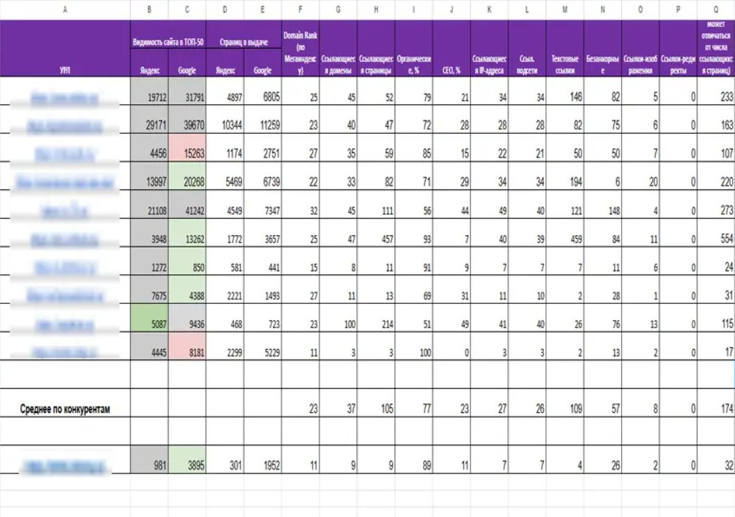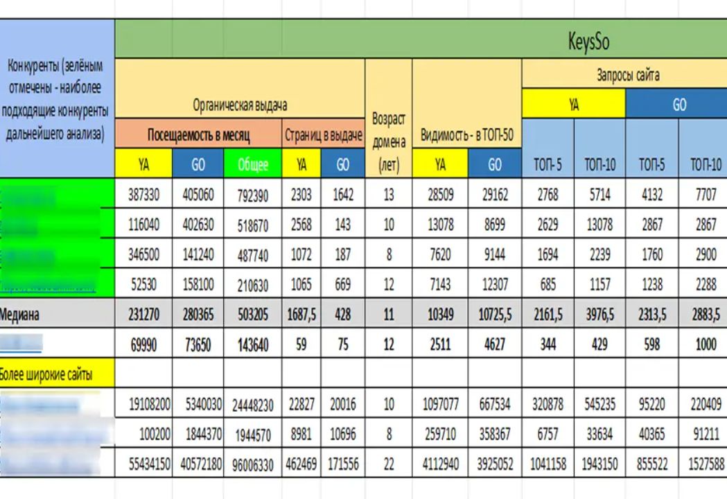 Для анализа мы используем Keys.so — сервис, который показывает SEO-показатели конкурентов: количество страниц в индексе, объем ссылочной массы, динамику трафика. Данные сводим в таблицу и вычисляем медианные значения — они точнее отражают «планку» для входа в топ.