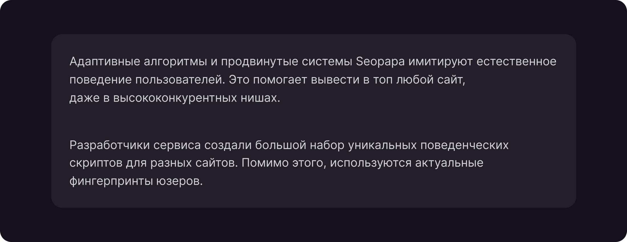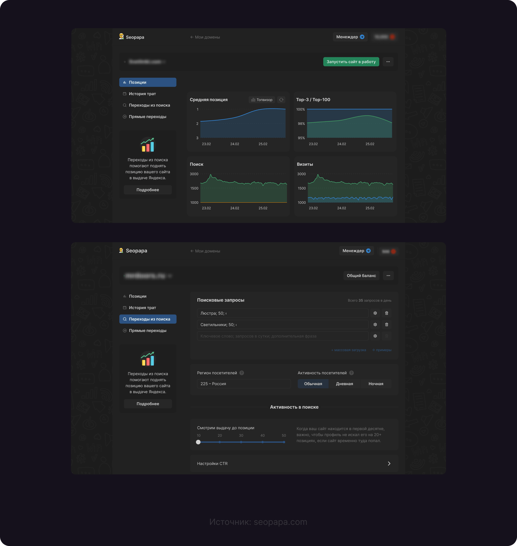 Особенность Seopapa — простота взаимодействия с сервисом. Пользователю не обязательно разбираться в прокси и антибот-системах: можно просто зайти в личный кабинет, добавить сайт, выбрать ключевые запросы и задать объем привлечения трафика. Сервис использует свою прокси-сеть по всей России и поведенческие сценарии, приближенные к реальным пользователям.