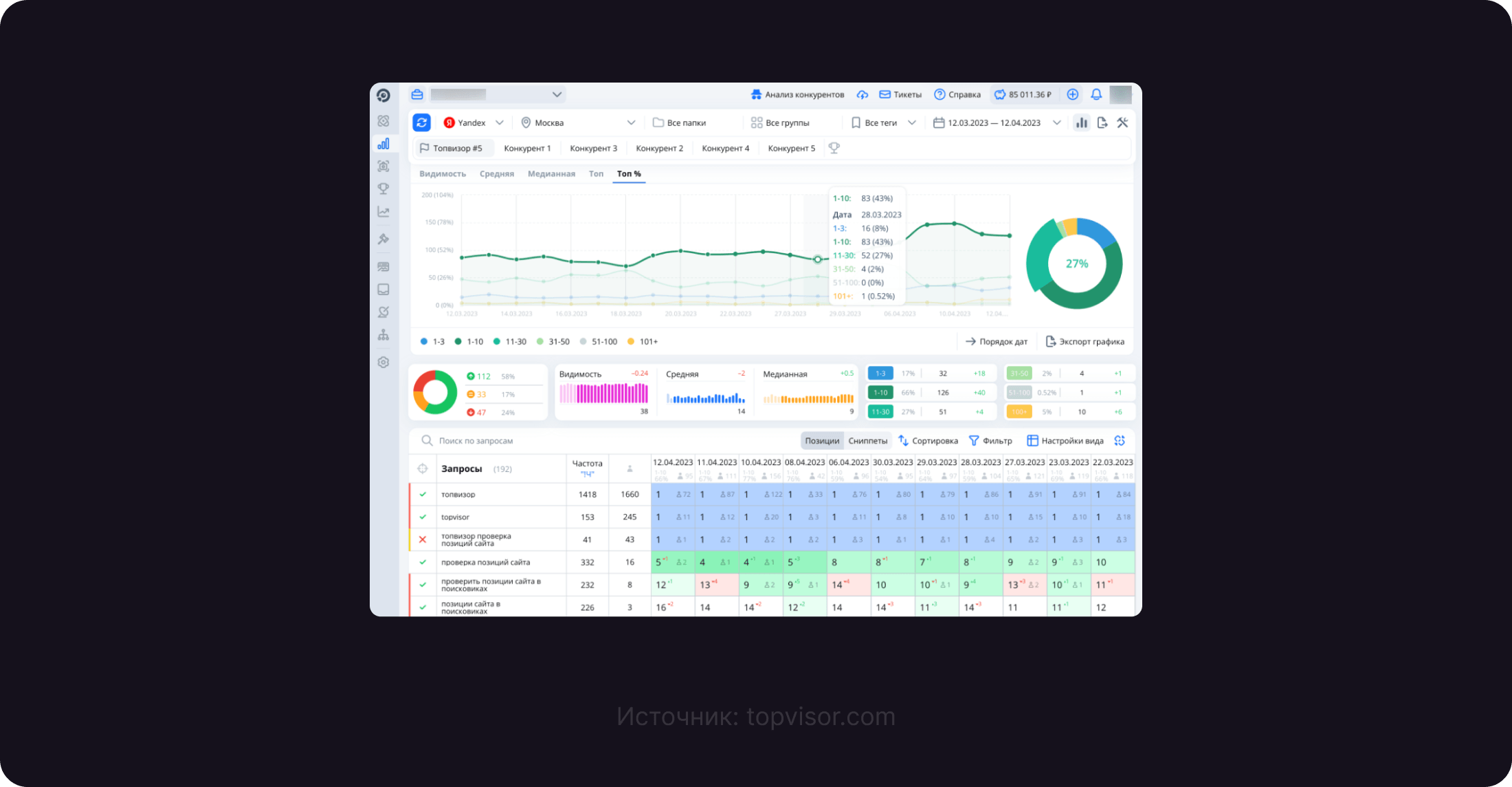Топвизор — это платформа для SEO аналитики, которая объединяет в себе отслеживание позиций, работу с семантикой, анализ конкурентов и техническую диагностику сайта. Сервис используют для системной работы с видимостью проекта, структурой страниц и контроля изменений позиций в поисковой выдаче.