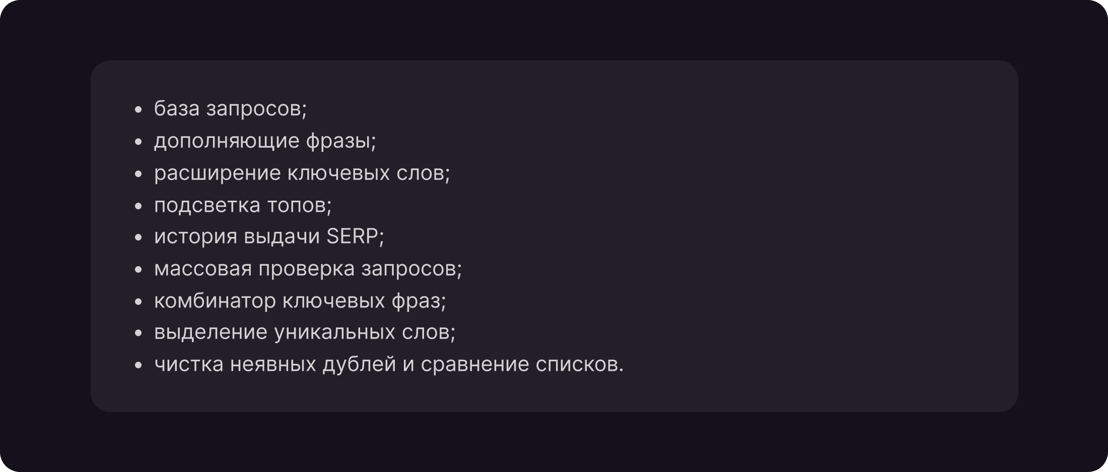 2. Широкий набор инструментов для работы с ключевыми фразами: от Wordstat и подсказок до кластеризации, чистки дублей и сравнения списков.