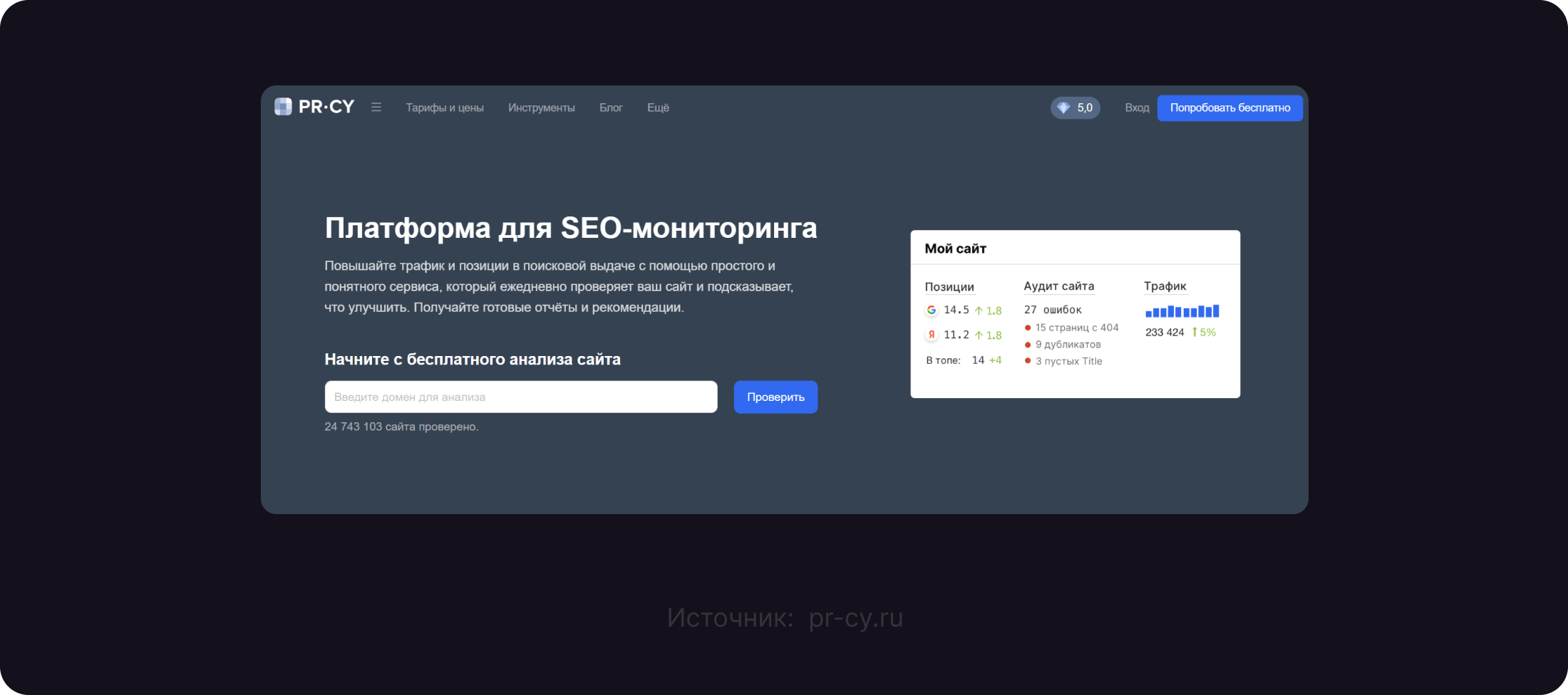 PR-CY — это платформа для SEO мониторинга, где в одном интерфейсе собраны инструменты по аудиту сайта, проверке позиций, мониторингу изменений и дополнительные функции для создания контент стратегии. Сервис помогает постоянно мониторить сайт: ежедневно проверяет проект, показывает, что улучшить, и формирует отчеты с рекомендациями.