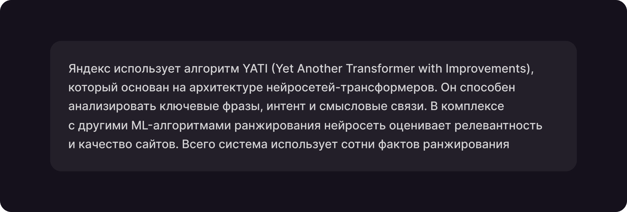 Поэтому Яндекс учитывает и продвижение дополнительных точек контакта: карточки организации, фиды, сниппеты. И в особенности стоит обратить внимание на AI-ответы. Яндекс активно развивает это направление, а сайты, которые точнее соответствуют поисковым запросам пользователей все чаще появляются в этом разделе.