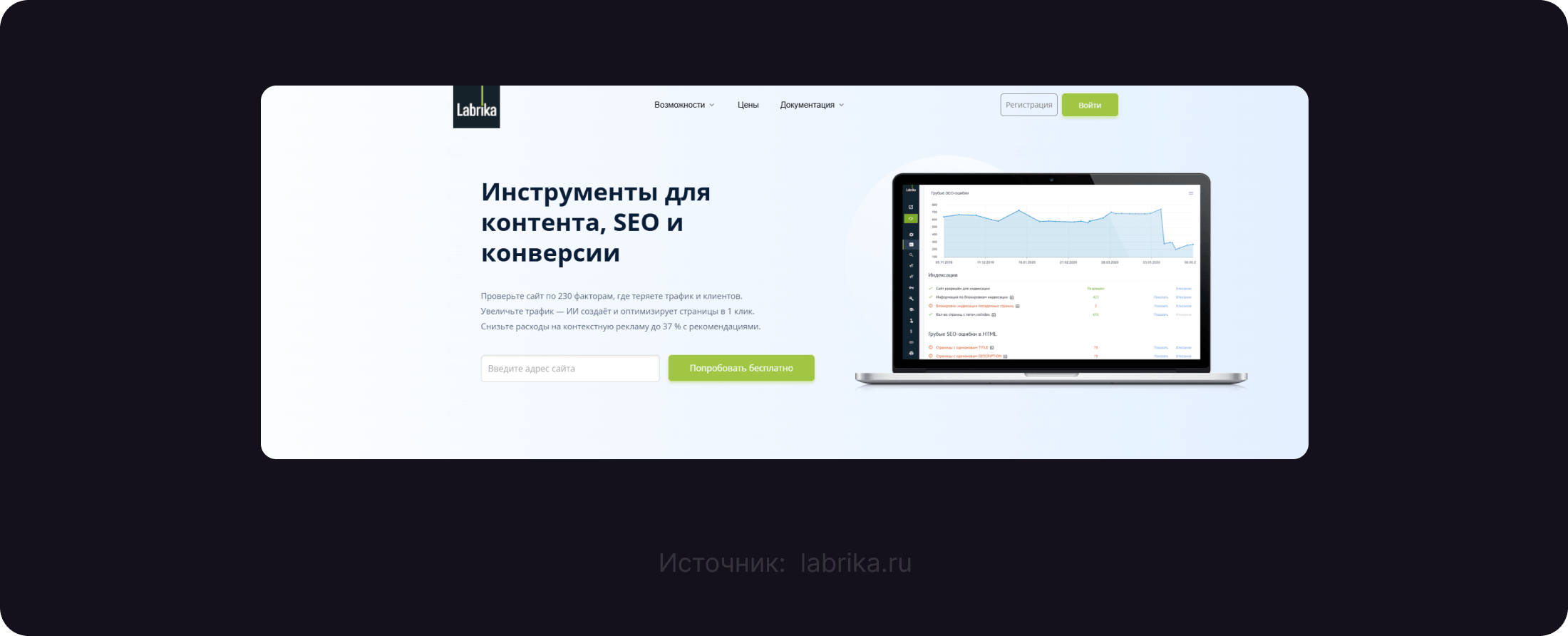 1. Комплексный SEO- и технический аудит. Labrika проверяет сайт по 230+ параметрам, находит технические и SEO ошибки, оценивает коммерческие и работает с поведенческими факторами.