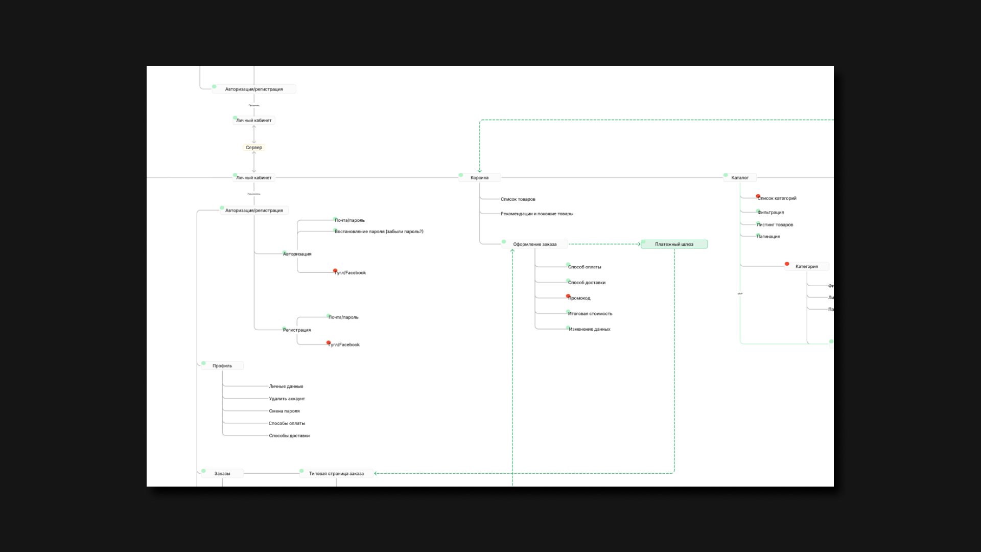 Для сложных проектов на этом этапе может составляться карта, подробно описывающая логику функционирования всего продукта в каждой из пользовательских ролей. Например, какие функции на каждой странице будут видны обычному пользователю, авторизованному пользователю, администраторам разного уровня. Обычно для разработки такой карты используются сервисы построения mind maps (например, xmind) или Figma.