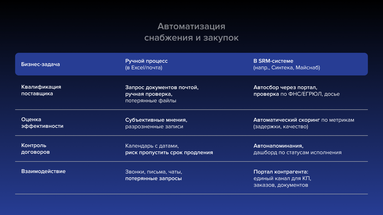 Автоматизация меняет философию работы закупщика: от реактивного выполнения заявок к проактивному управлению рисками. Эффект достигается при построении интегрированной экосистемы: SRM для управления контрагентами, ERP для операций, ЭДО для документооборота, аналитические инструменты для контроля.