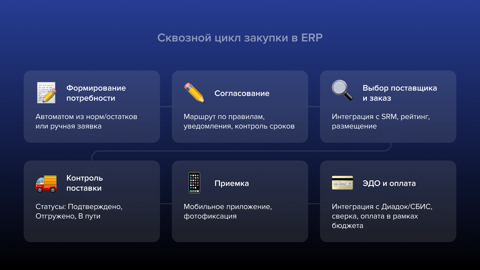 Если SRM – это стратегический уровень взаимодействия, то операционный уровень закрывают ERP-системы. Они автоматизируют ежедневные процессы снабжения от момента возникновения потребности до оплаты счета.