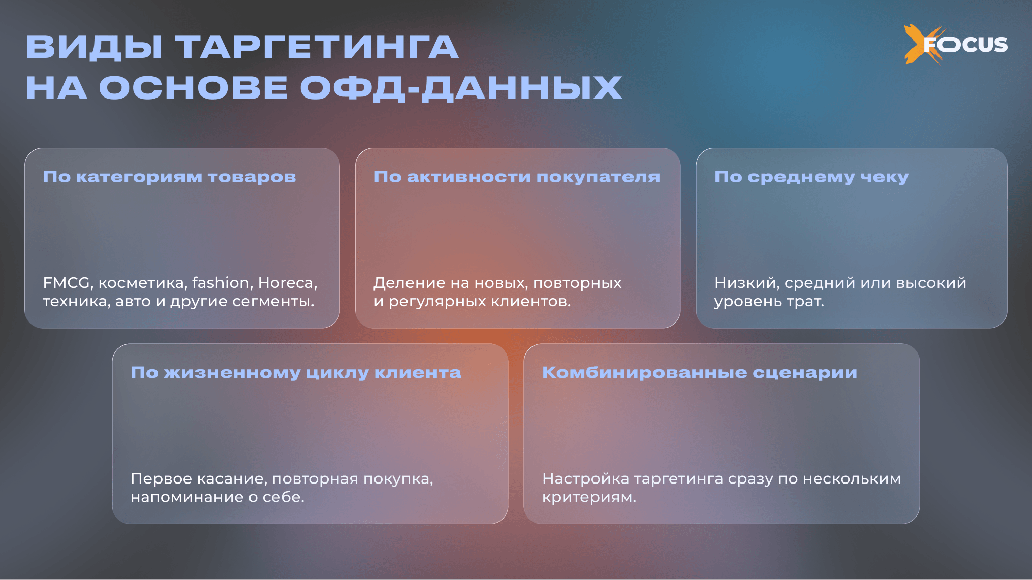 Сегменты XFocus формируются на основе реальных покупок и помогают решать конкретные маркетинговые задачи брендов. Платформа также предоставляет доступ к широкому набору таргетингов, включая категорию товаров, активность покупателей, уровень среднего чека и жизненный цикл клиента. Возможна комбинация фильтров и индивидуальная настройка под KPI, а интеграция с гео-, социально-демографическими и поведенческими данными повышает результативность рекламных кампаний.