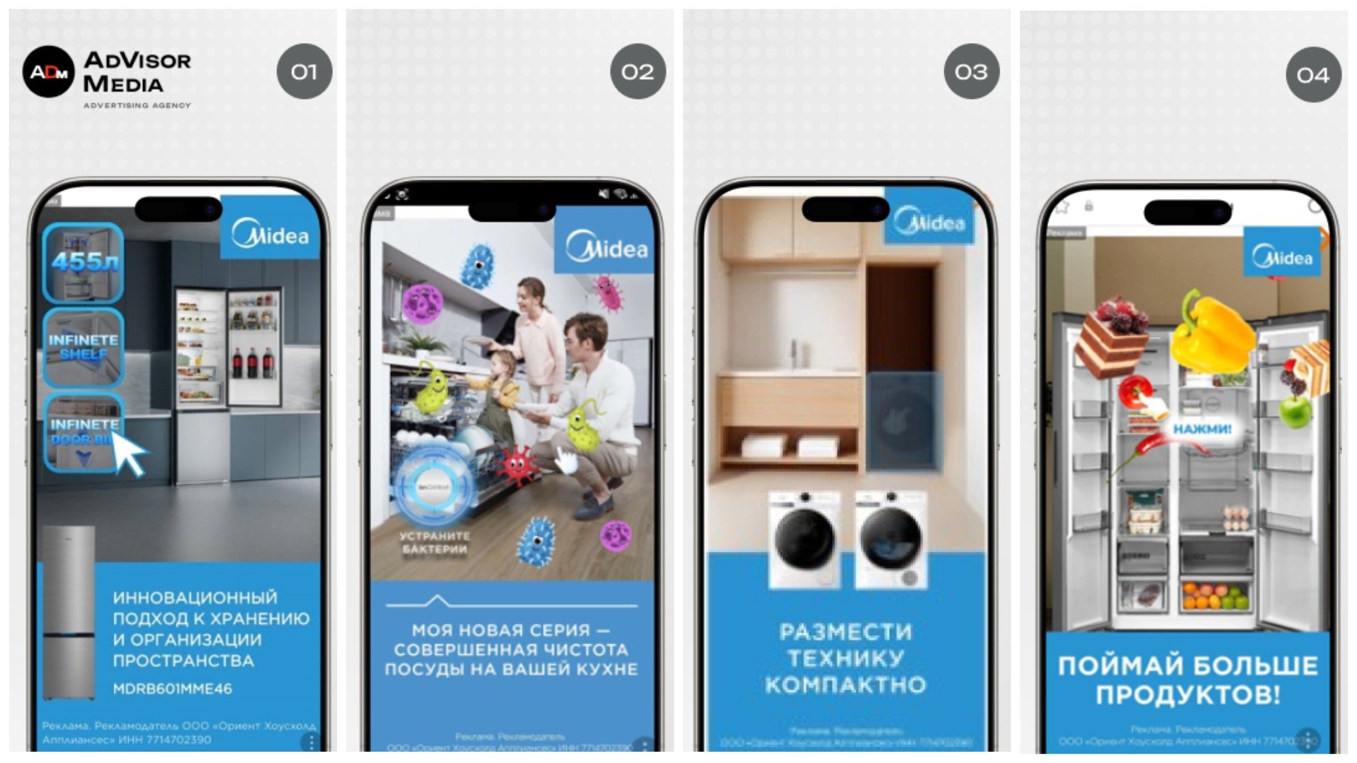 Для китайского бренда бытовой техники и уникальных технологических решений Midea мы реализовали серию интерактивных мобильных баннеров через платформу Otclick, сфокусированную на геймификации и performance‑форматах.