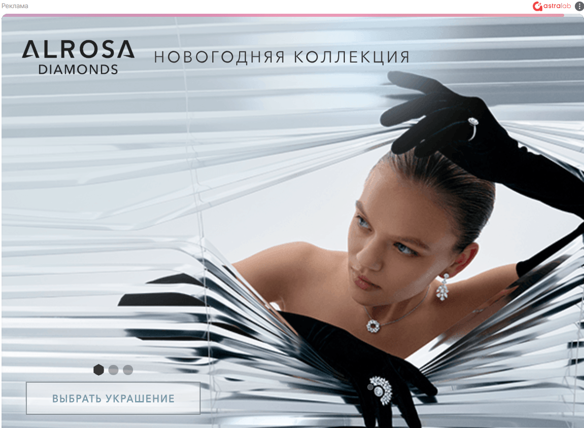 Пример: Новогодний креатив AstraLab для ALROSA Diamonds. В нижней части размещён CTA‑блок «Выбрать украшение» с индикаторами галереи, который ведёт пользователя дальше по интерактивному сценарию – к просмотру ассортимента и выбору подарка.