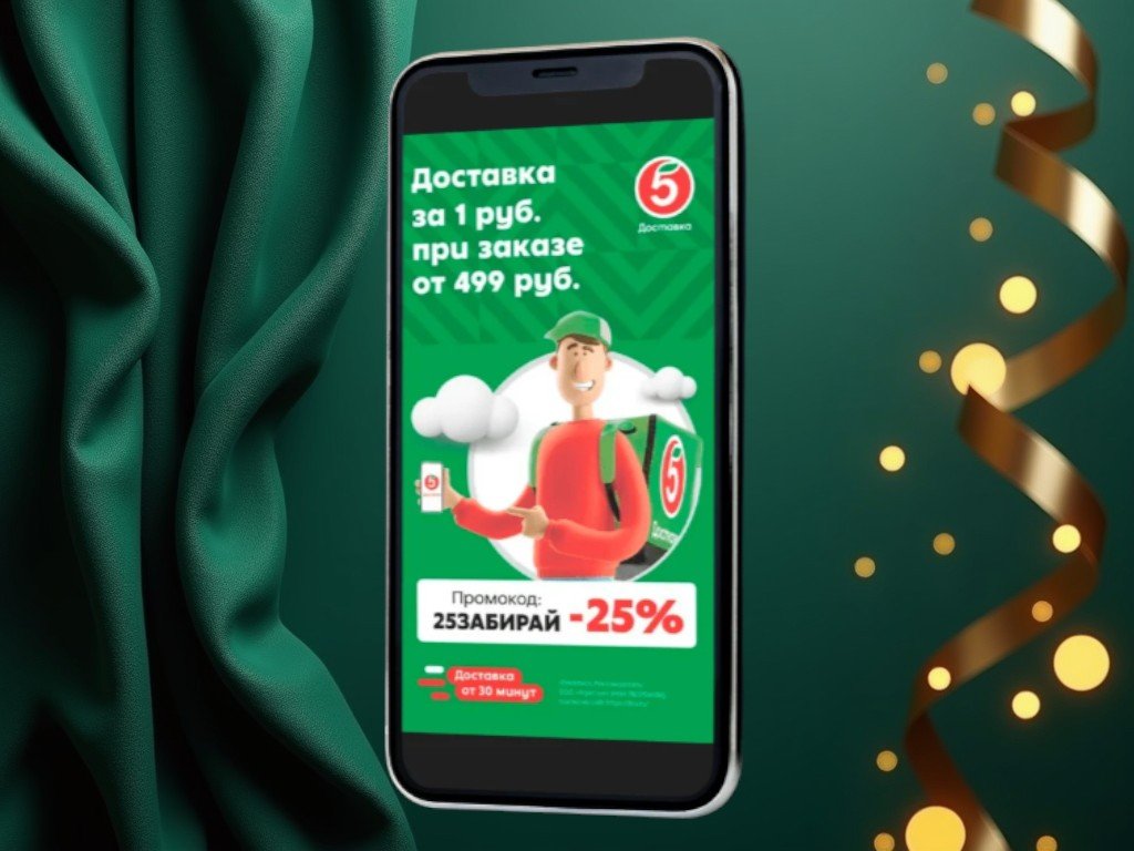 Пример: кейс MOBIDRIVEN для сети «Пятёрочка» в формате полноэкранной in‑app‑рекламы: информирование аудитории о промо-акции, стимулирование установок приложения клиента.