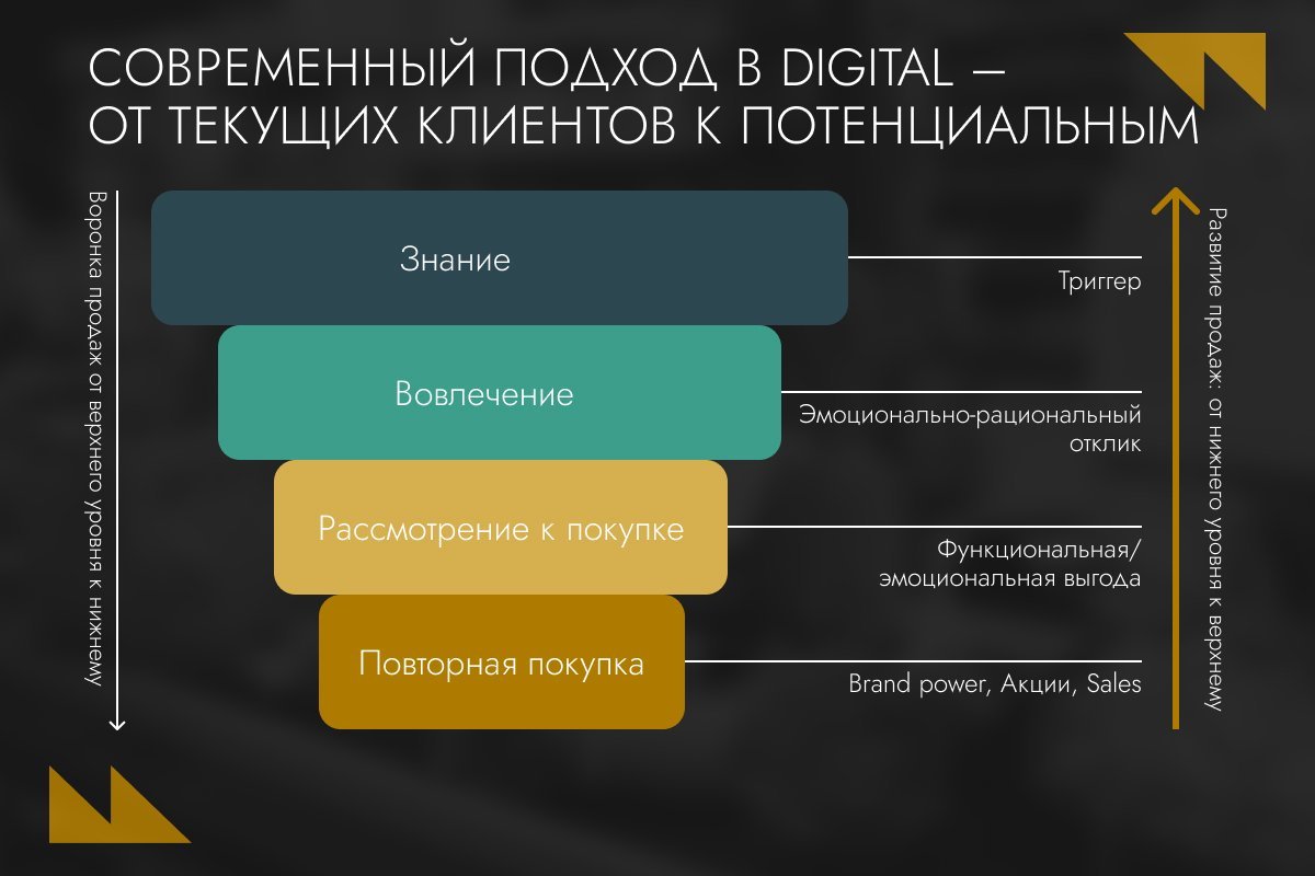 — Решение этой задачи — насытить охватные кампании подключением вовлекающих механик, Big Data и Data текущих покупателей. 15-20% бюджета следует инвестировать в тесты новых инструментов на среднем уровне воронки.