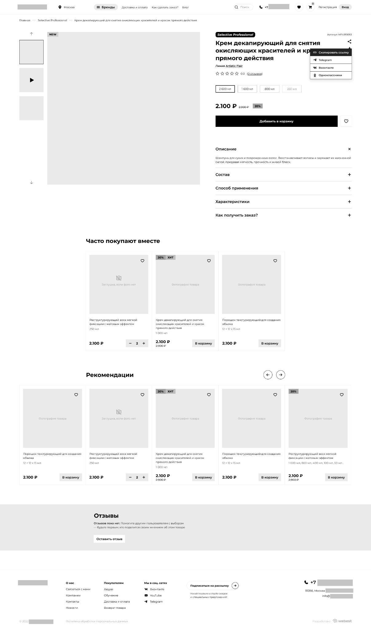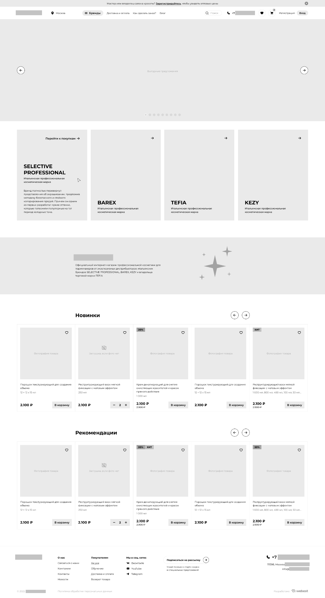 UX-прототип — это черно-белая схема страницы. Он фиксирует, какие элементы и в каком порядке будут на ней расположены: где будет, к примеру, фотография товара, кнопки, какие фильтры будут доступны пользователю и прочее. На этом этапе мы продумываем структуру всего сайта: какие будут разделы, типовые блоки и их содержимое (фото, видео, текст), где будет находиться меню, поиск по сайту, контакты и так далее.