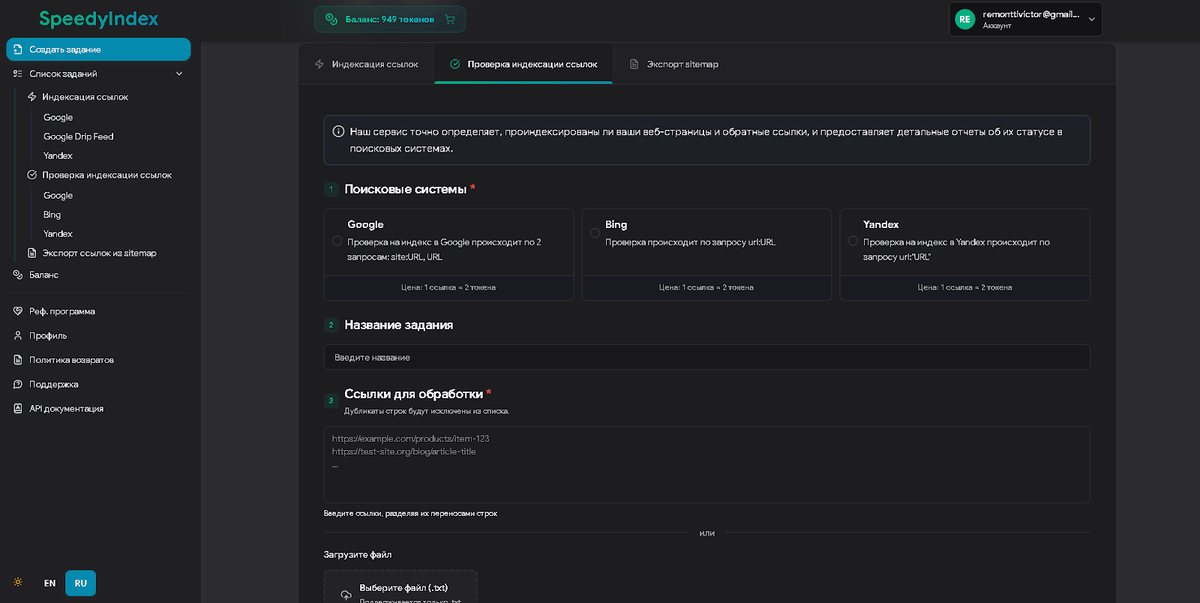 SpeedyIndex автоматизирует рутинную работу SEO-специалистов и владельцев сайтов. Вам больше не нужно вручную отправлять каждый URL в Search Console и ждать — проверка индексации Google происходит в пару кликов.