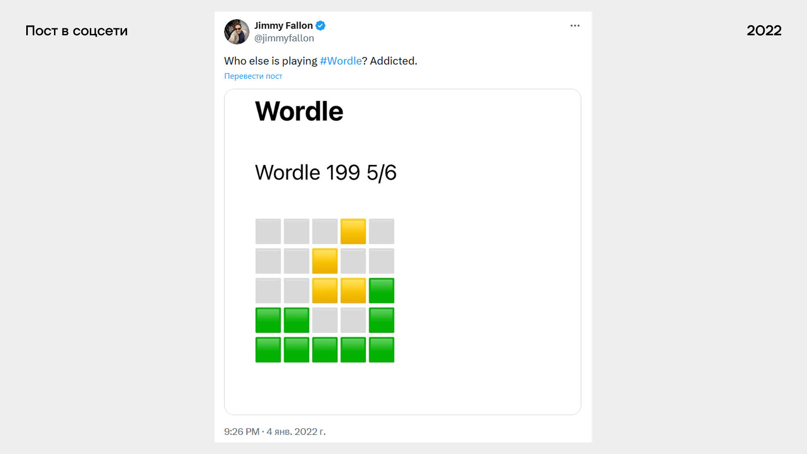 Особую роль в популяризации Wordle сыграл социальный эффект. Люди массово делились в интернете своими результатами с помощью цветных квадратов, не раскрывая при этом загаданное слово. В итоге, по данным опроса Morning Consult в 2022 году, 26% респондентов узнали об игре из социальных сетей.