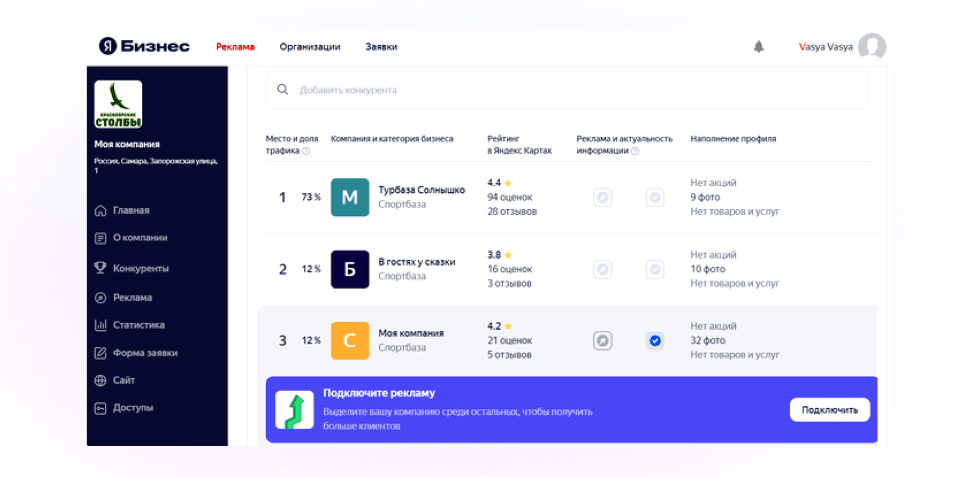 Раз в неделю проверяйте в Яндекс.Бизнесе, как работаю ваши конкуренты: наполнение профиля, активность, есть ли у них реклама и подписка. Если у «соседей» включено приоритетное размещение, а у вас нет, то они перехватывают показы и ваша карточка видна реже.