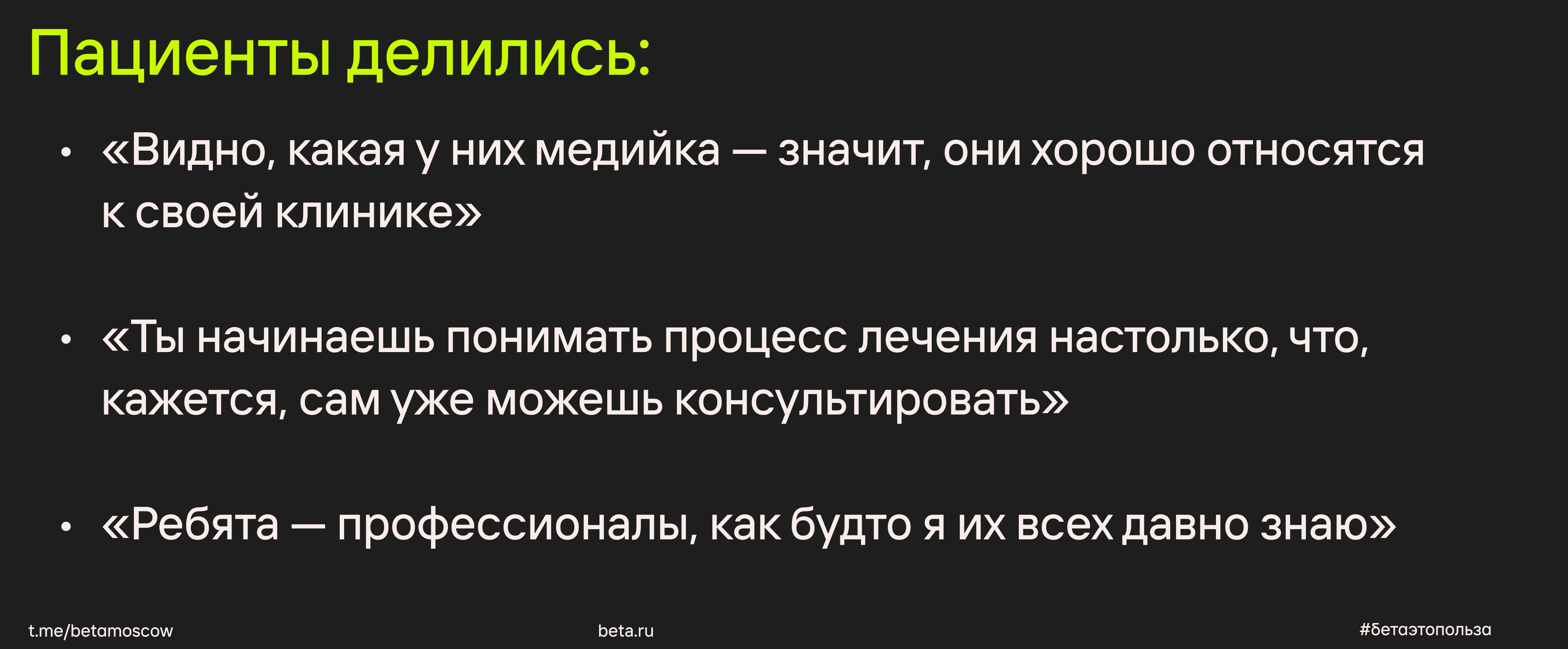 Мы выяснили, что люди заходили на главную страницу и смотрели, «нормальная ли это клиника». Многим нравилось, что на ней не было кричащих акций на всё подряд. Их отталкивали подобные баннеры в других клиниках.
