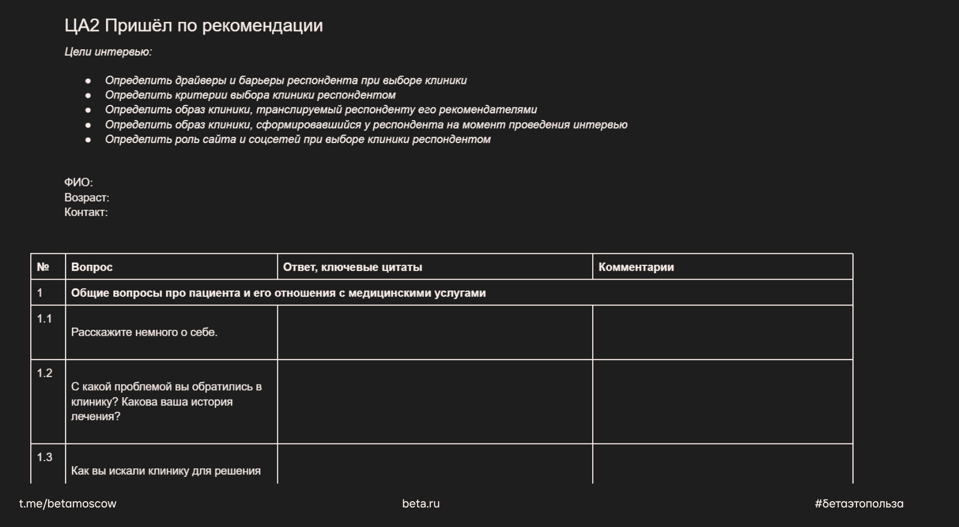 Мы анализировали аудиторию в самом начале проекта, чтобы увидеть клинику глазами ЦА и понять, как сделать сайт полезным и удобным. Выбрали метод — глубинное интервью. Это разговор, во время которого исследователь задаёт открытые вопросы респонденту, выясняет его мысли, чувства и мотивацию при использовании продукта.