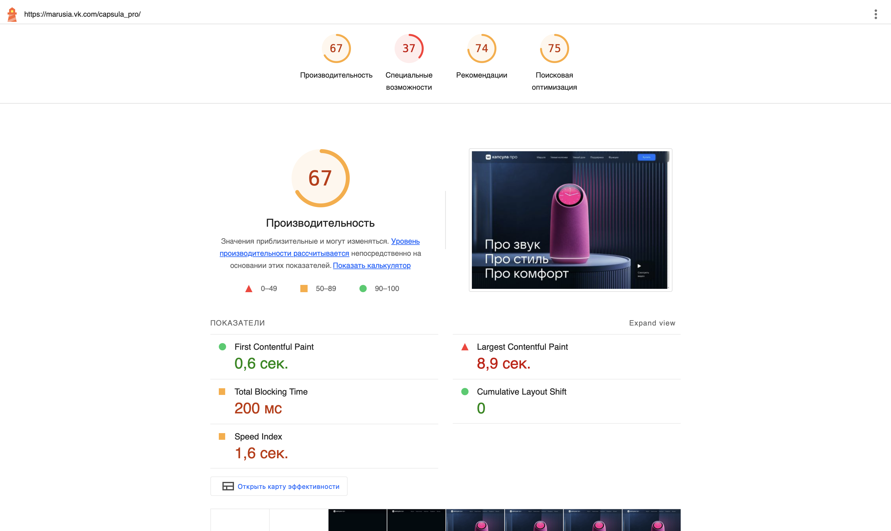 Метрика «Производительность» штука не постоянная и её значение может отличаться на разных устройствах. Например, у нас выдало 67% — и это довольно низкий результат.
