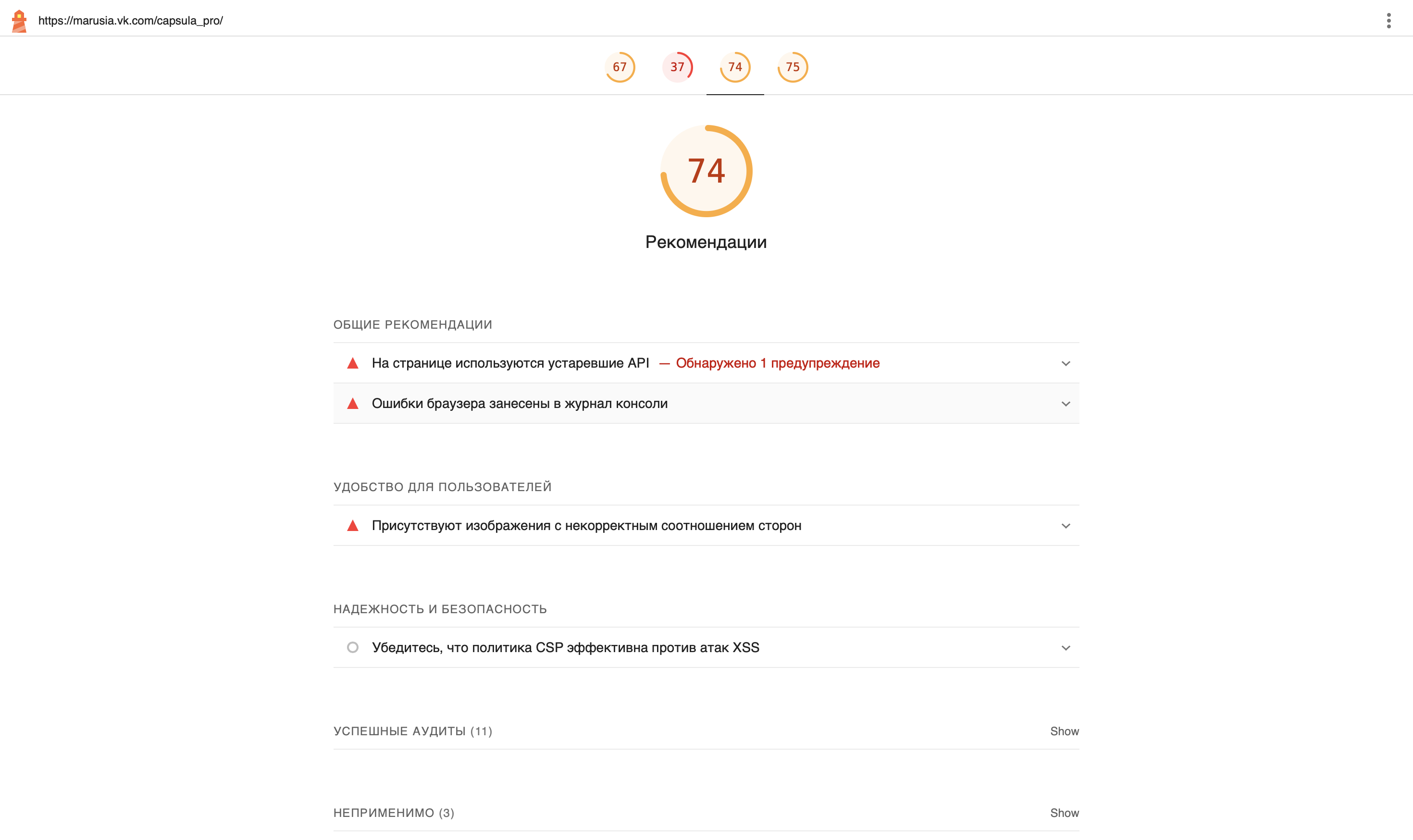 Здесь программа показывает нам общие ошибки, которые больше связаны с кодом и разработкой. Например, ошибки в консоли могут быть связаны с подключаемыми сторонними виджетами или плагинами браузера — они не критичны.