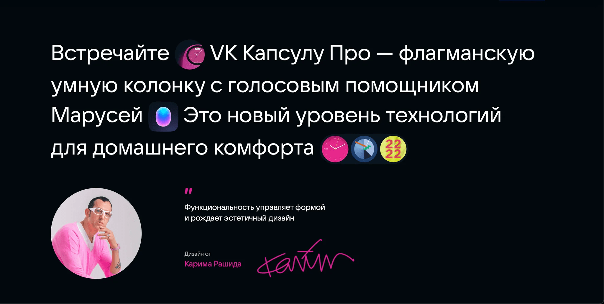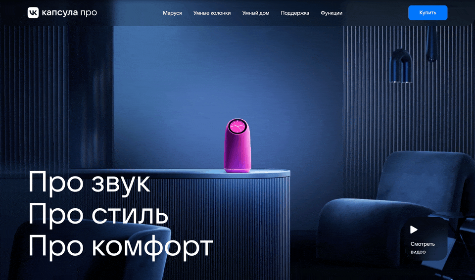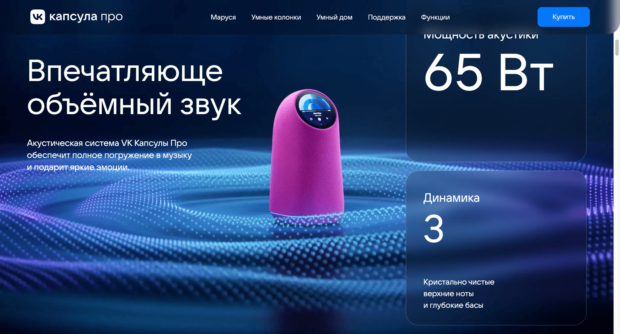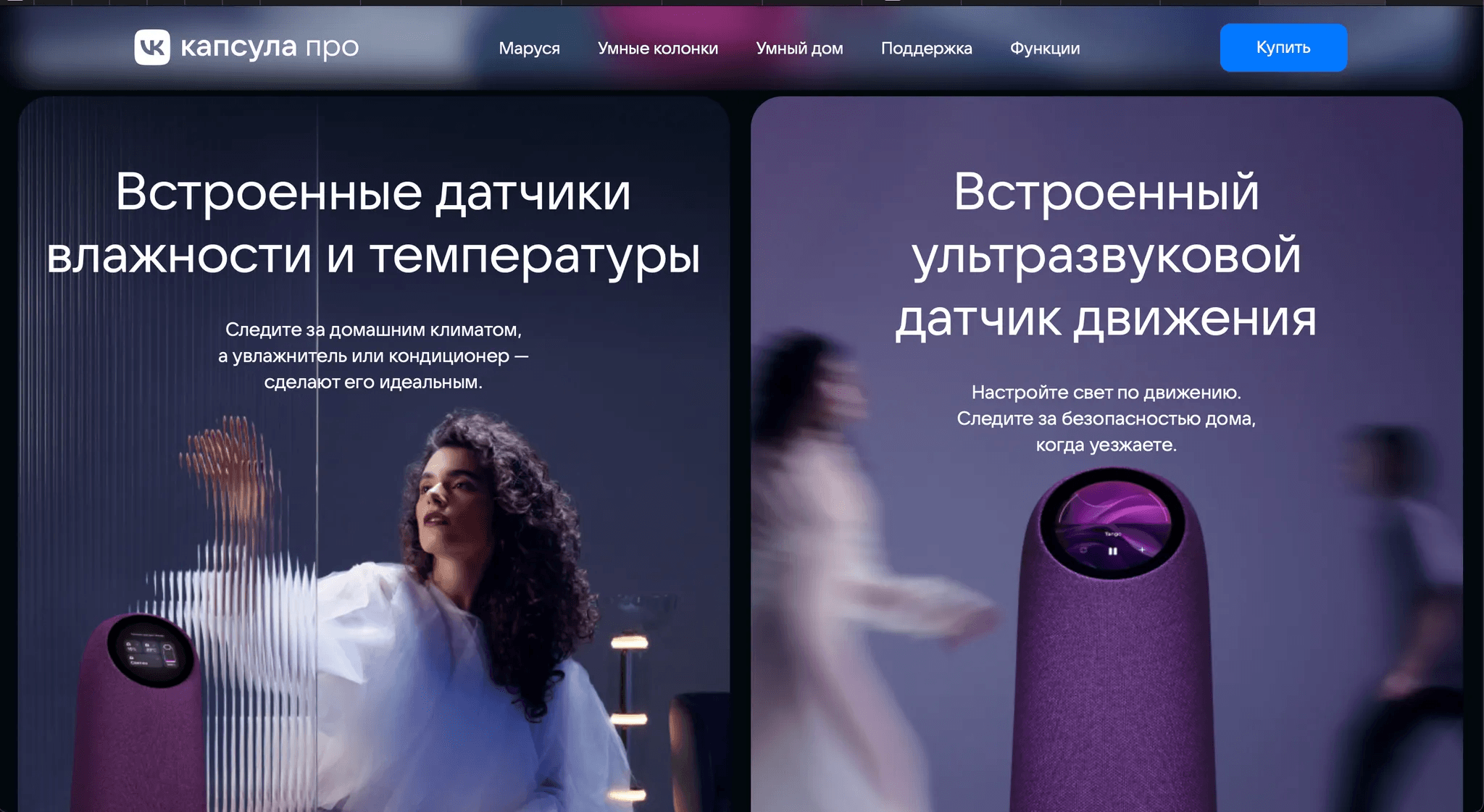 Есть свежая страница https://marusia.vk.com/capsula_pro/ У неё удачная структура, страница продает лайфстайл, похожа на типичную страницу Apple. Понятна целевая аудитория, их юзкейсы, их JTBD, которые закрывает колонка. Остальные страницы пока не дотягивают — есть потенциал! Думаю, что они будут тоже в будущем обновляться. Интересно, будет ли сегментация по ЦА и юзкейсам, как будут позиционироваться разные колонки (например, сейчас есть попытка представить одну из колонок как «детскую»)