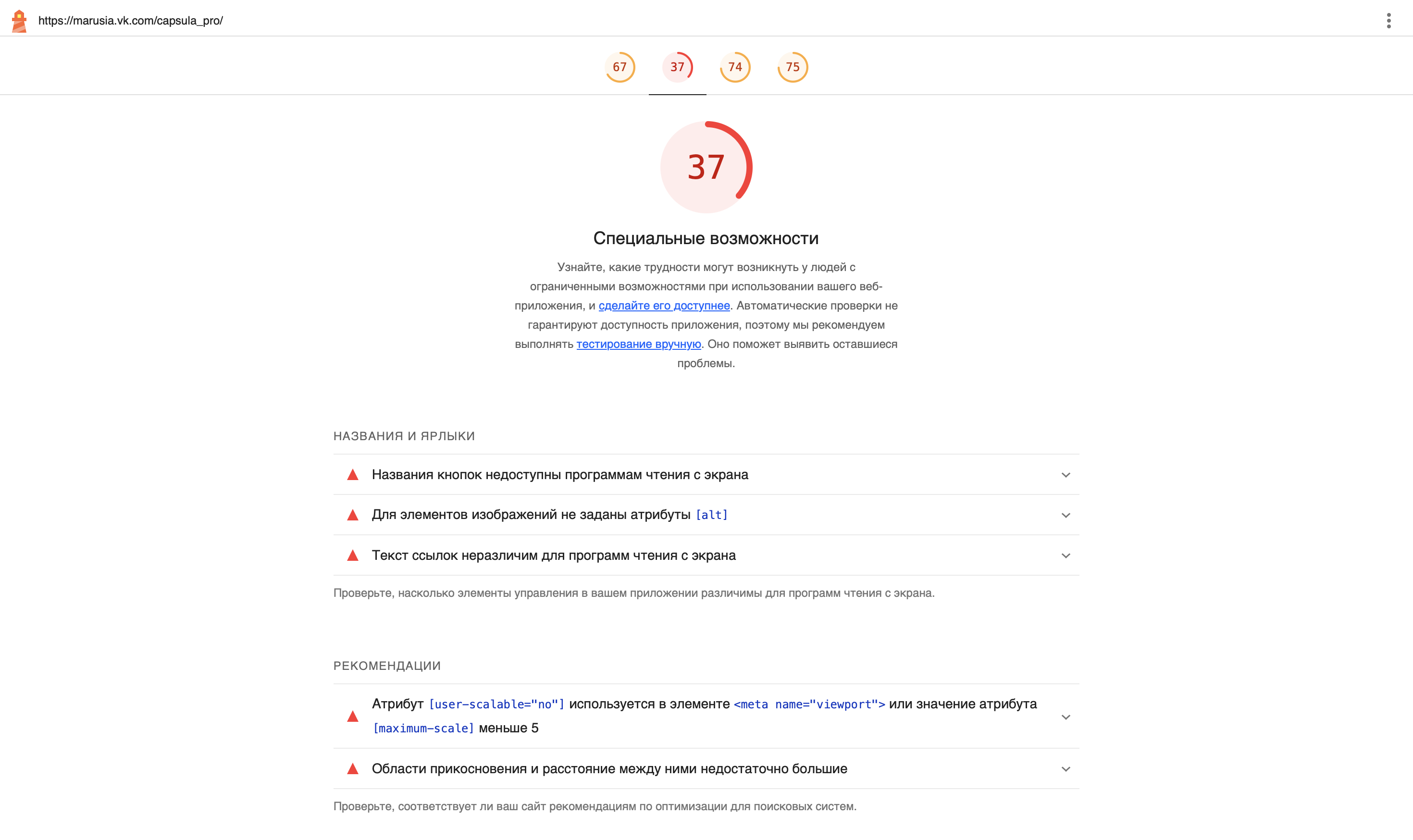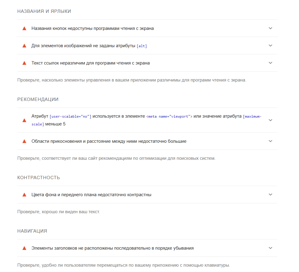 Здесь Lighthouse помогает нам определить, какие трудности могут возникнуть у людей с ограниченными возможностями.