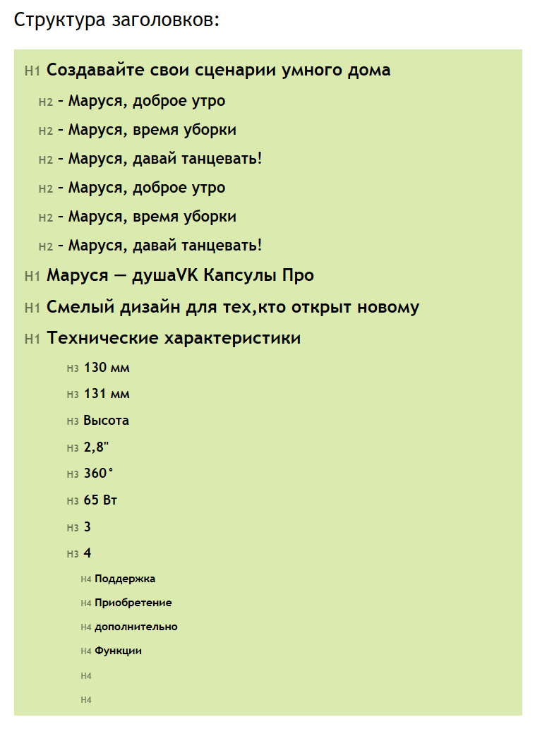 В разметке заголовок H1 обычно используется один на всю страницу сайта. Например, на странице с Капсулой Про он используется в главном блоке с видео. Но при этом, ещё почему-то появляется ниже в другом блоке. В итоге, структура ломается.