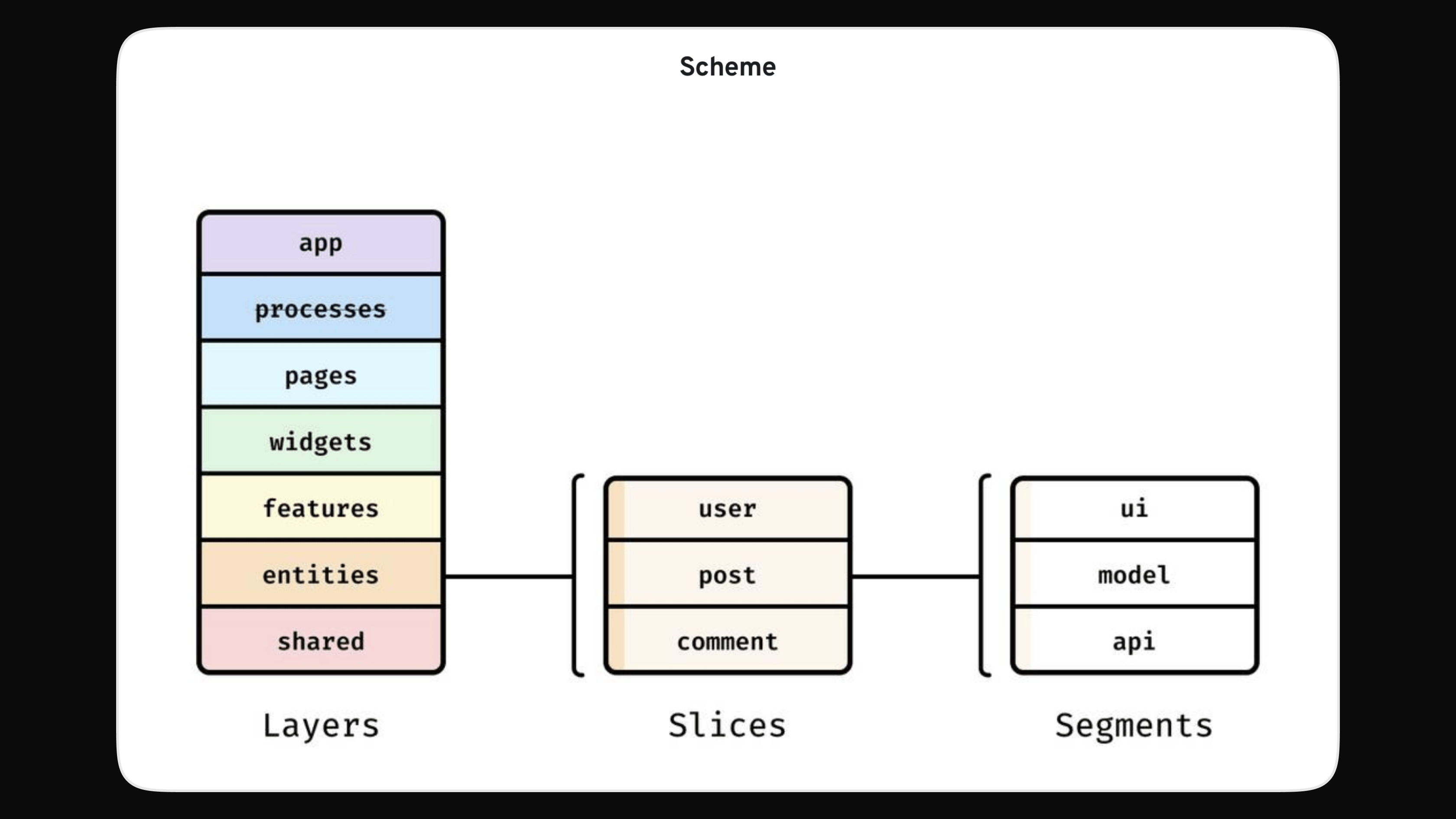 Посмотрели в сторону известной методологии Feature slide design (FSD), в которой используется 3 уровня абстракции — слои, слайсы и сегменты. Проще говоря, это сборник правил и соглашений по организации кода.