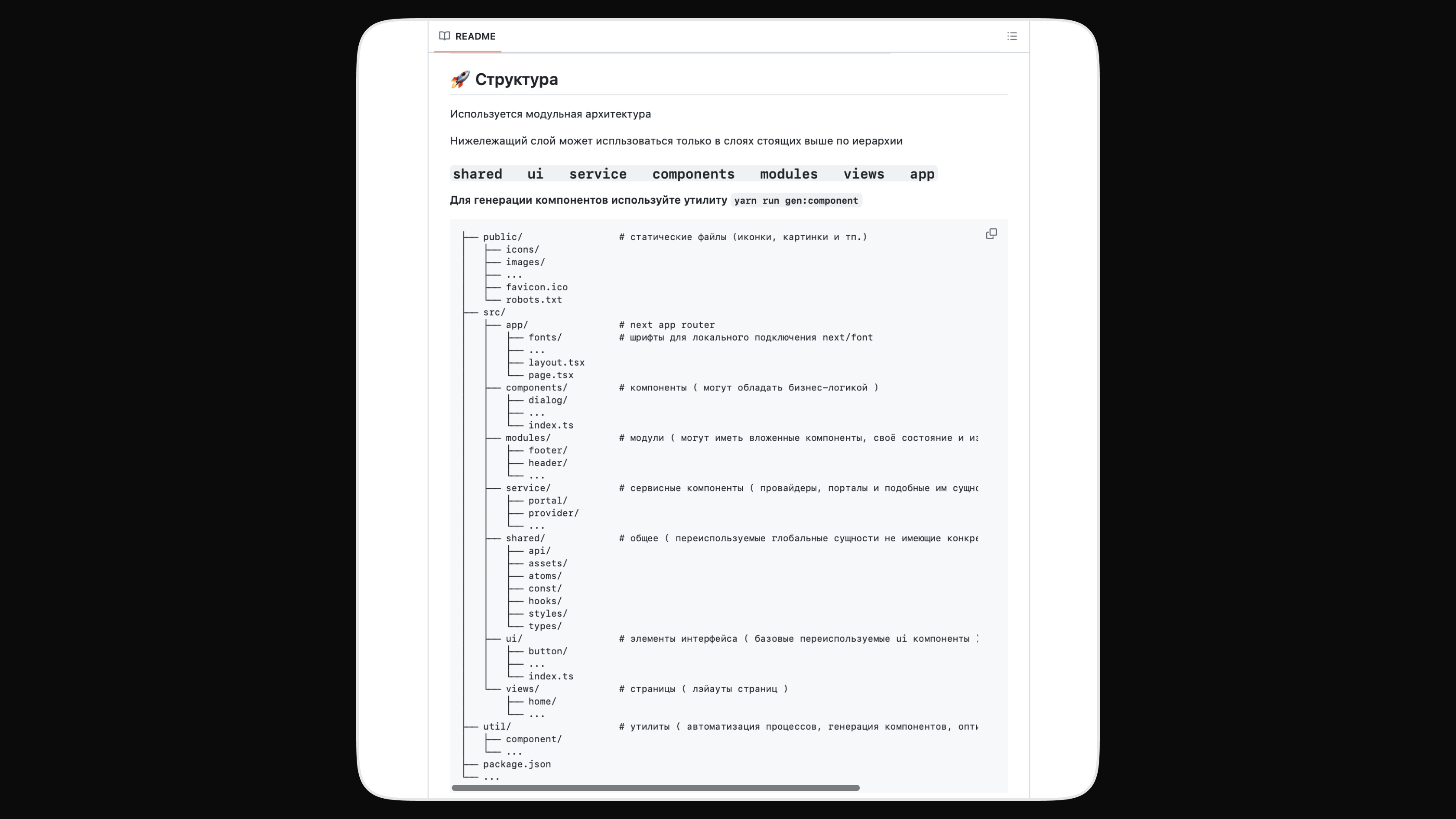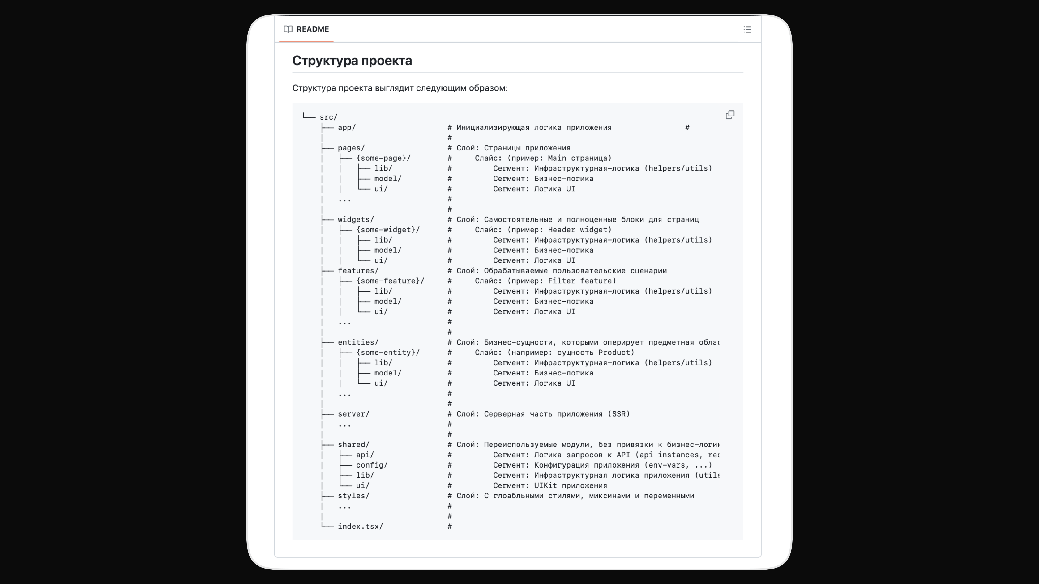Если просто, то мы смешали опыт всех разработчиков Лиги, добавили принципов Feature-Sliced Design и получили модульную архитектурную модель. Установили базовые пакеты, которые всегда используем на проектах. Плюс настроили линтеры и Prettier для автоматизации контроля качества кода.