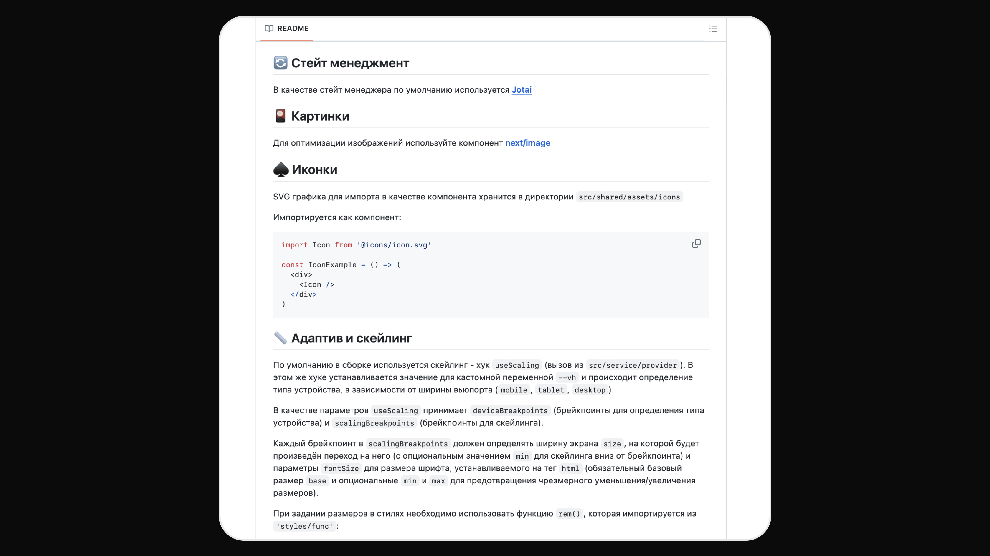 По дефолту стоит менеджер, свой универсальный скейлинг, который мы уже давно написали под себя. Например, по умолчанию используем легковесный стэйт менеджер Jotai, библиотеку для написания запросов Axios и заранее написанные хуки (например наш кастомный скейлинг).