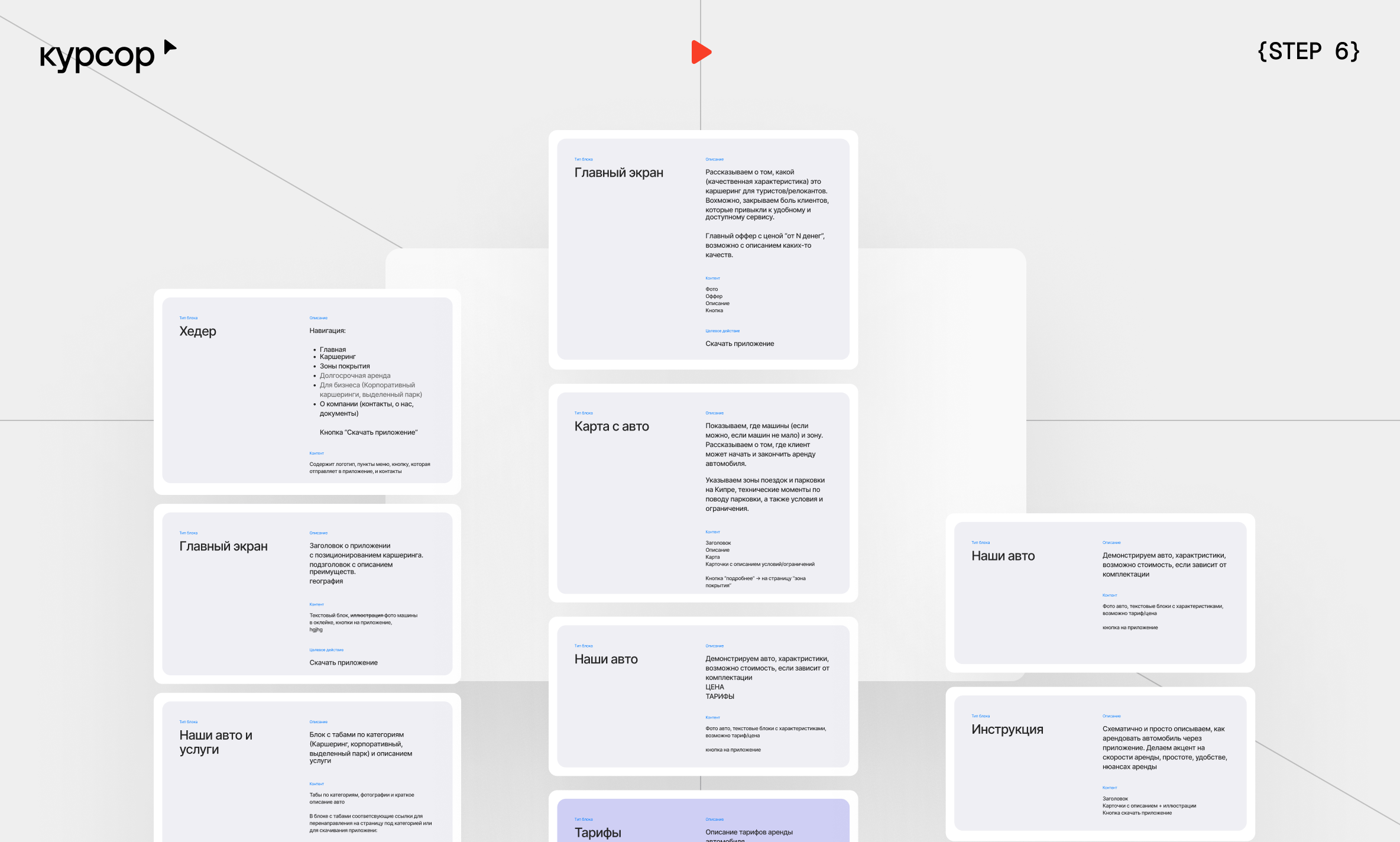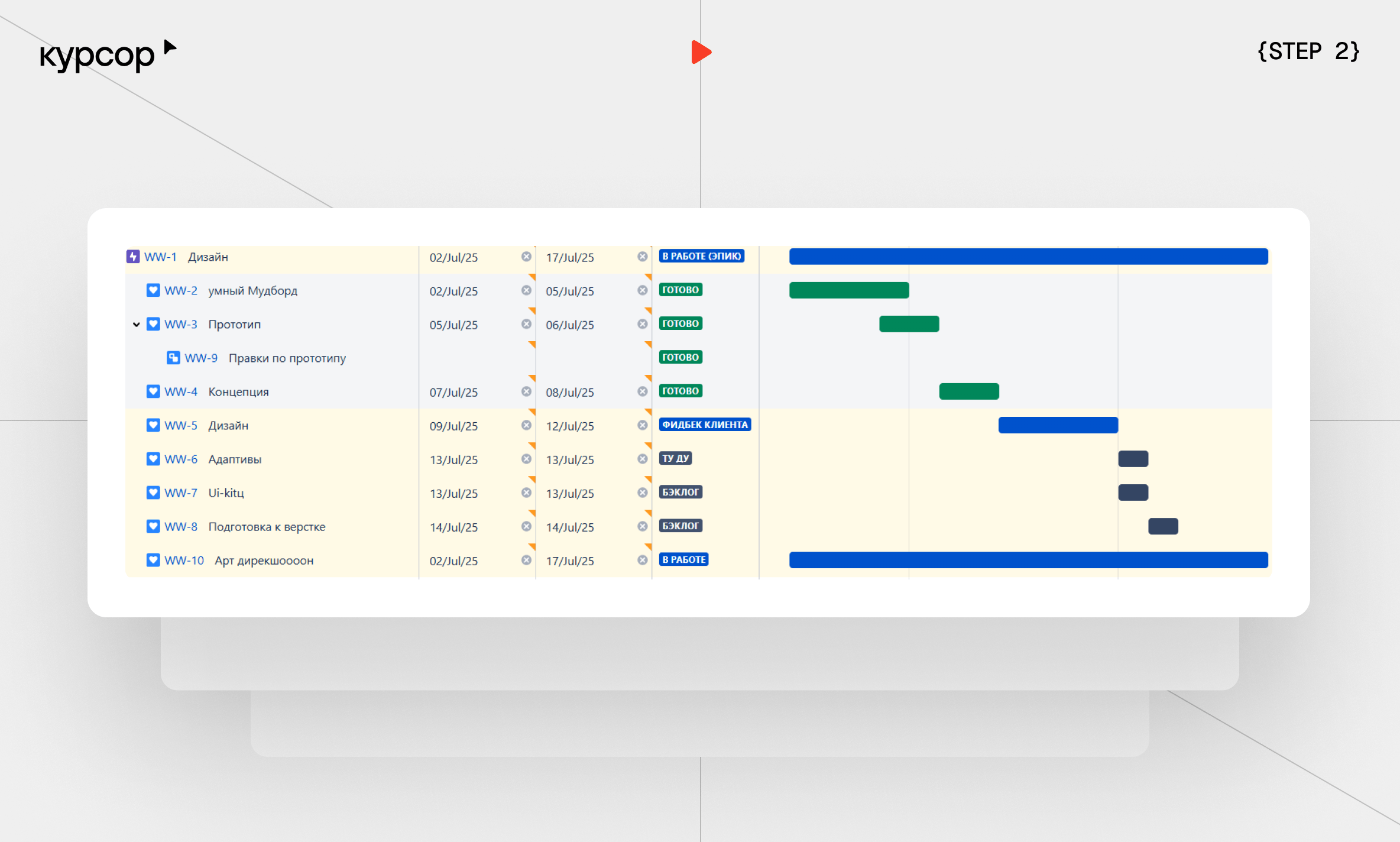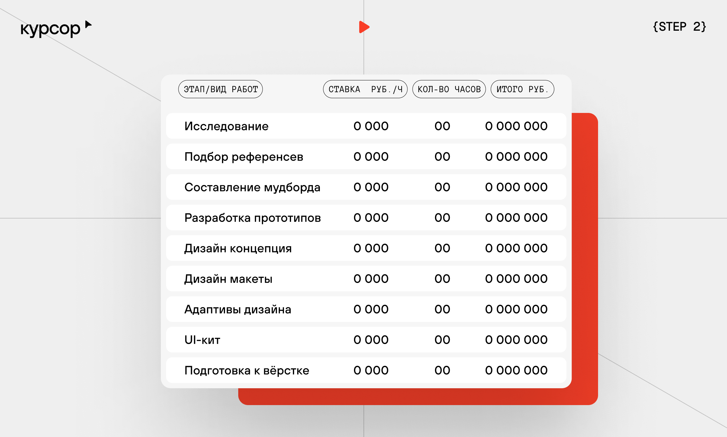 Дальше намечаем примерный таймлайн и логику внутренних чекпойнтов: когда какие куски работы планируем сдавать. Сразу закладываем время на согласование каждого этапа.