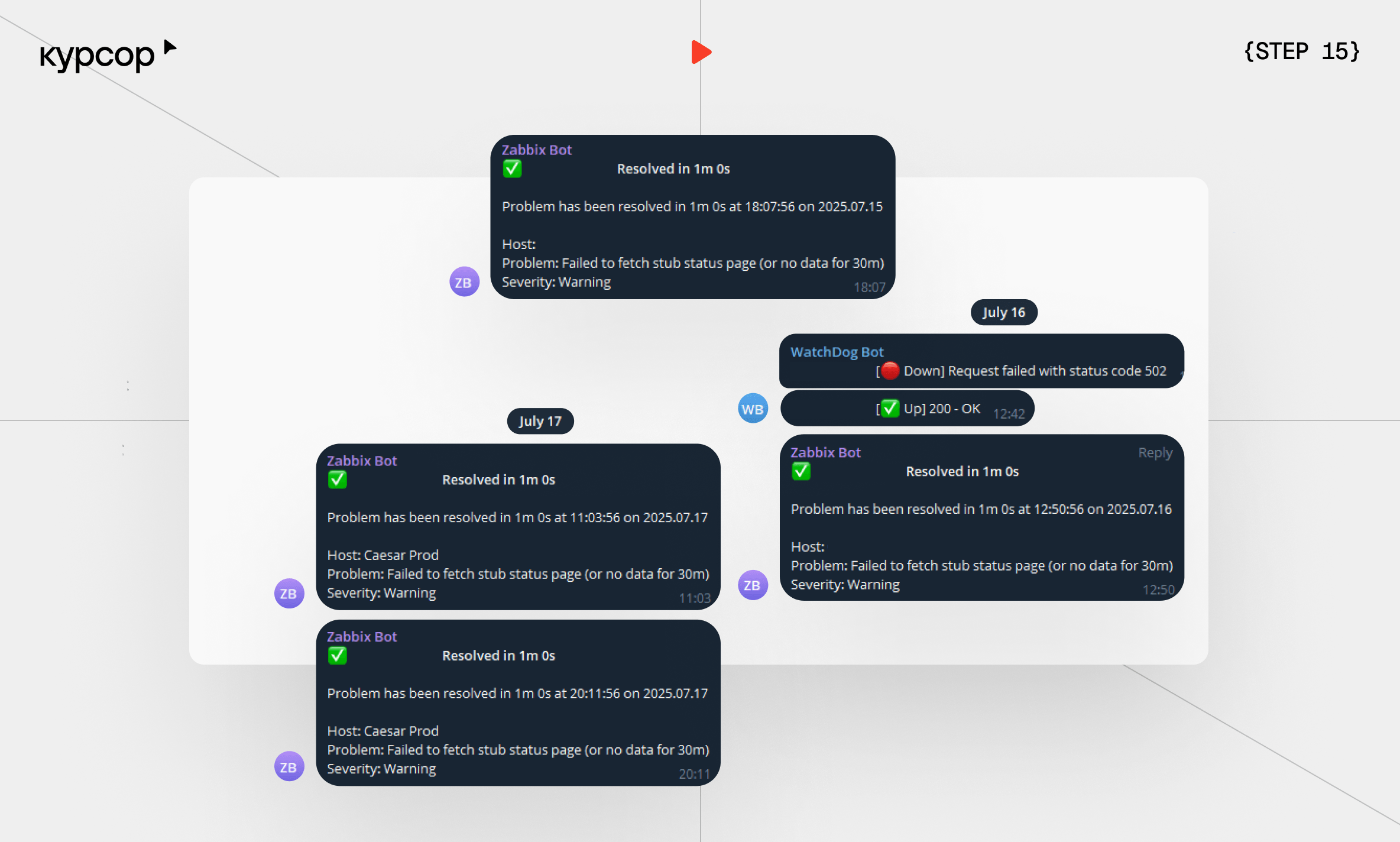 Базово мы прикручиваем аналитические инструменты Яндекса и Гугла. А за дополнительную плату можем ещё и мониторинг через Телеграм-бота привязать. Тогда вам будет приходить статистика по посещениям и общему состоянию сайта. А если возникнут неполадки или сайт ляжет, вы узнаете об этом в течение 2 минут.