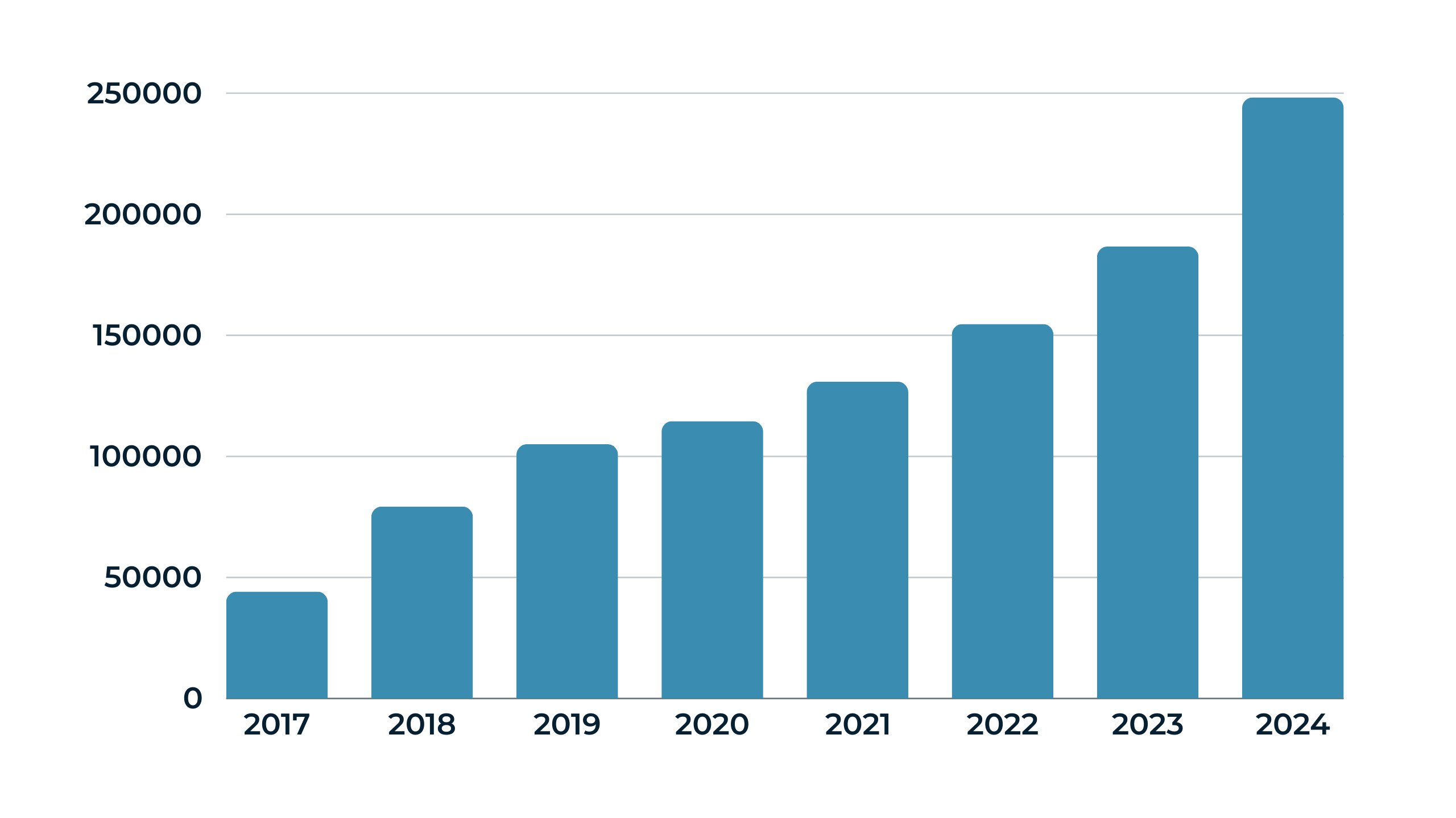 Это можно заметить на графике ниже - в 2024 году бизнесы оцифровали в 2 раза больше клиентов, чем в 2023.