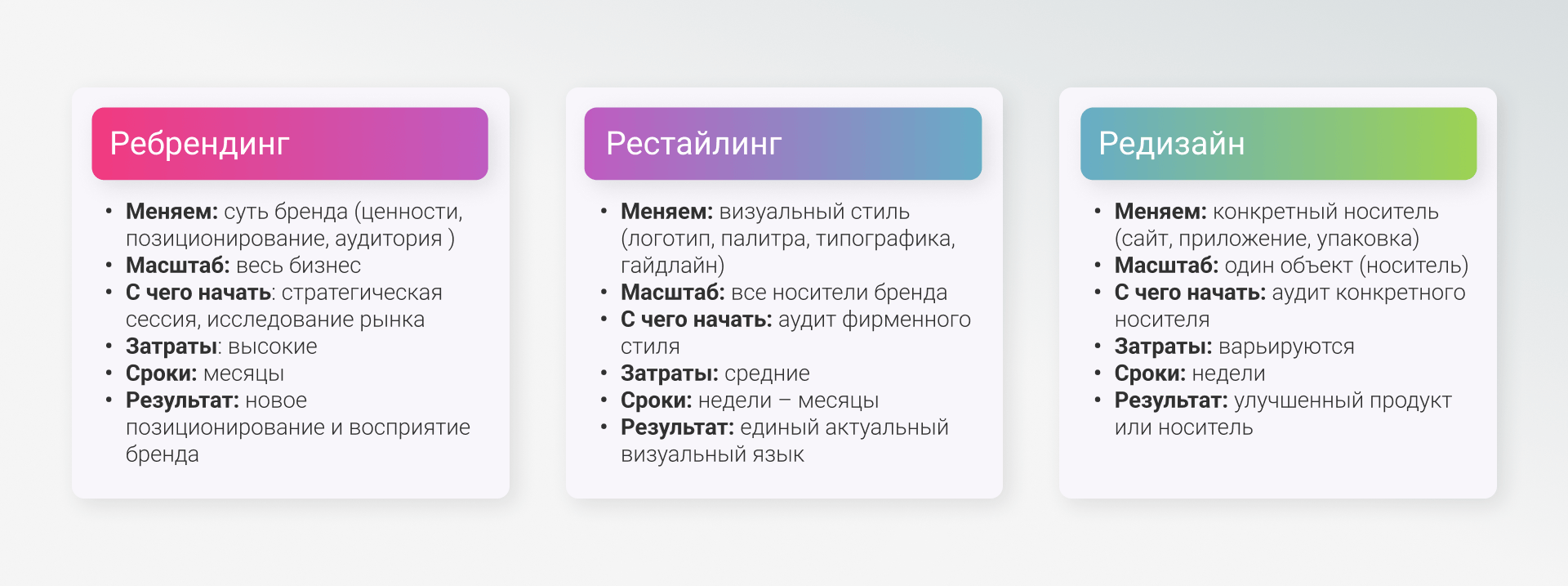 Ребрендинг меняет суть, рестайлинг — форму, редизайн — реализацию. Задача — не угадать, а точно определить уровень изменений.