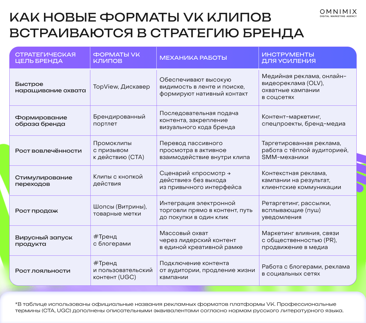 Эти механики подробно разобраны в первой части материала OMNIMIX — «Сила короткого видео: рекламные возможности VK клипов». В ней рассматриваются интеграции с блогерами, брендированные спецпроекты и сценарии нативного присутствия брендов в VK Клипах.