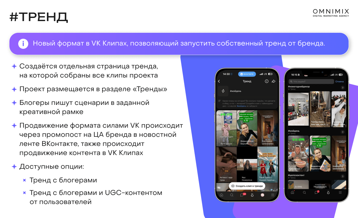 Формат #Тренд отражает стратегический подход VK к работе с креативными блогерами, работающими с нативными форматами. Бренд получает возможность запустить собственный тренд с отдельной страницей проекта, где аккумулируются все клипы кампании.